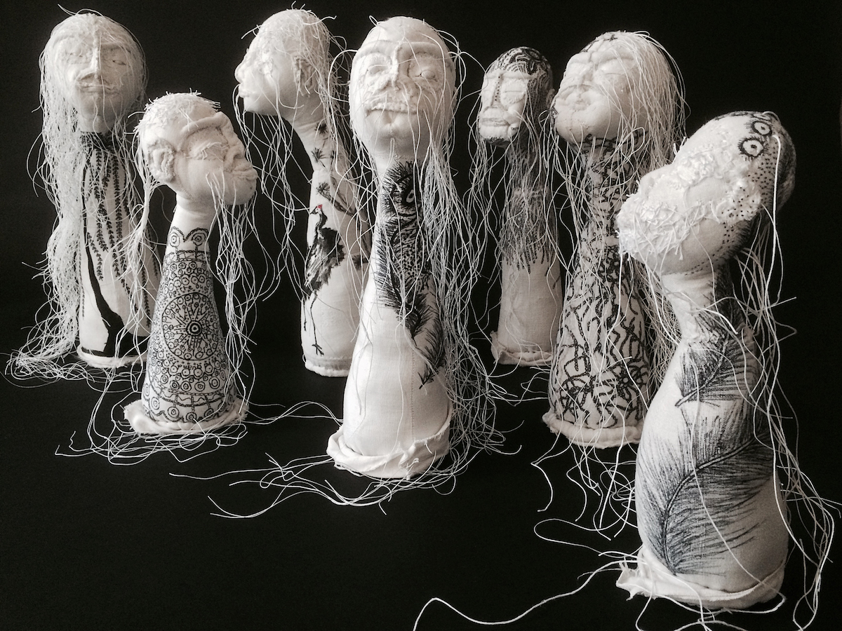 Sculptures textiles en drap de métis blanc recyclé, broderie main, tatouage différents symboles.