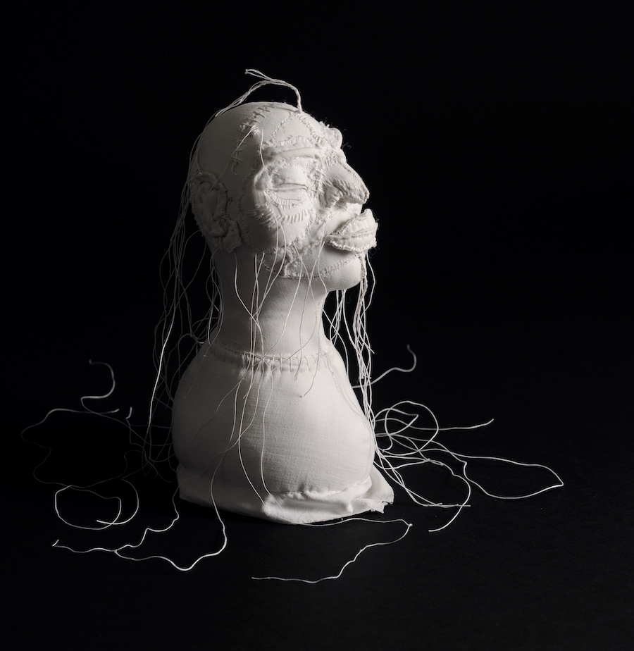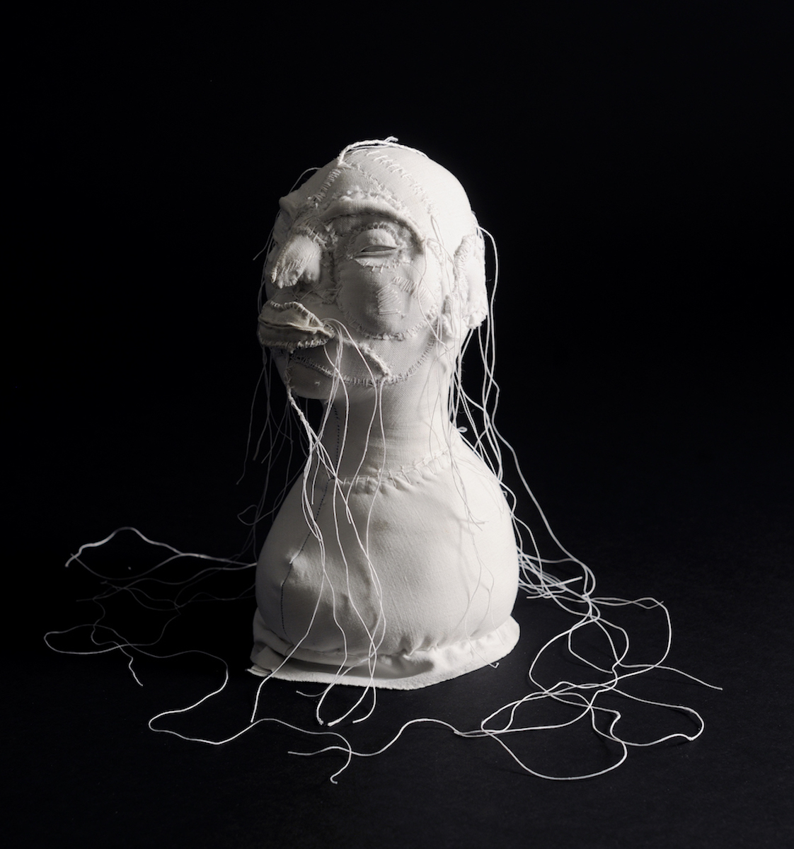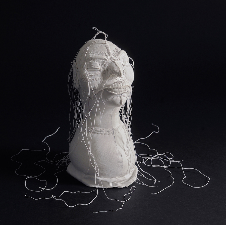 Sculpture, art textile en drap de métis recyclé, portrait blanc, illustrant l’état méditatif, tapisserie et broderie à la main, intérieur en coton, 32 cm.