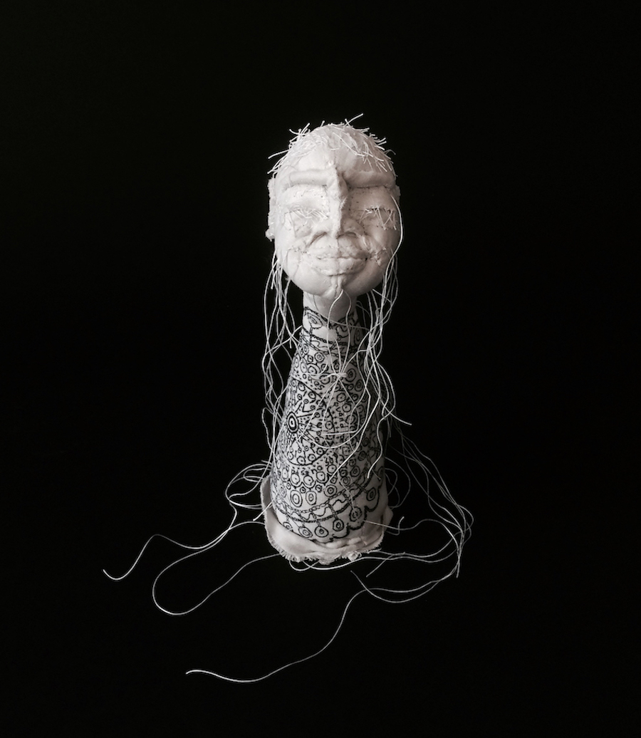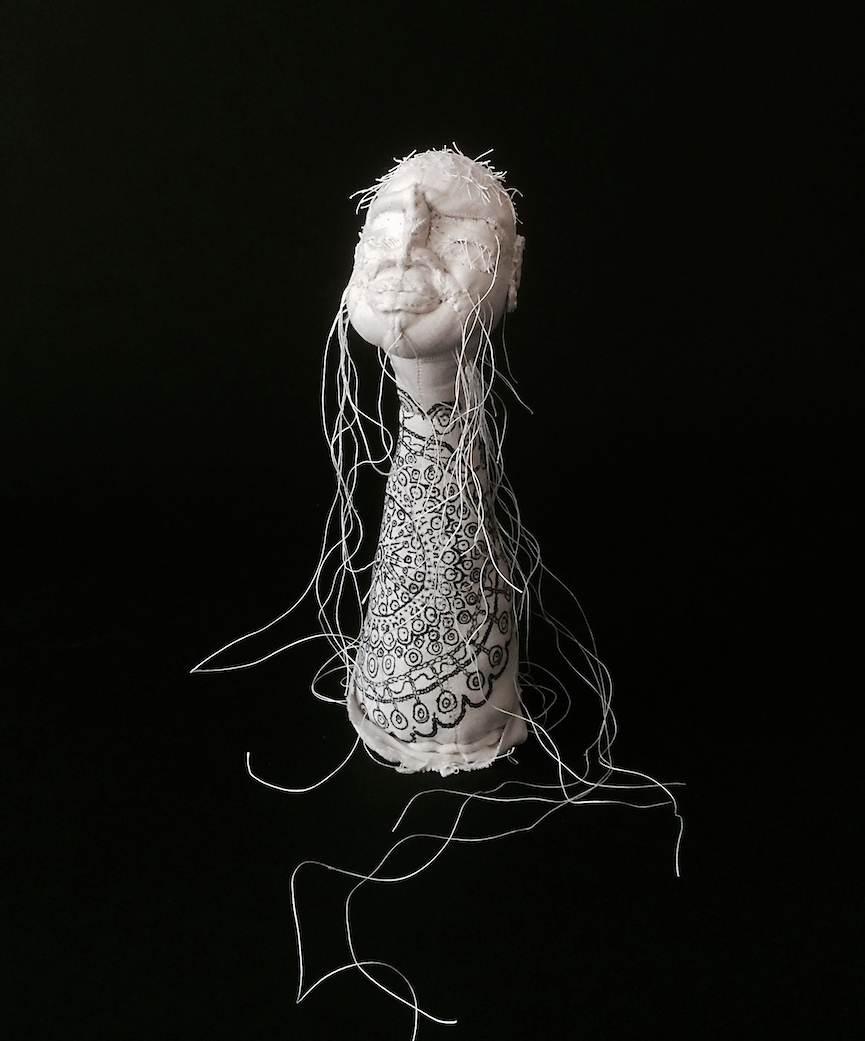 La forme de la toile est celle de la forme du monde, nous tissons notre destin , la présence de l’araignée nous invite à explorer aussi nos côtés sombres, les tensions, l’inconfort, les peurs que nous ressentons dans certains domaines de notre vie. Sculpture en métis blanc recyclé, broderie et tatouage toile d’ araignée, 26 cm, 90 €