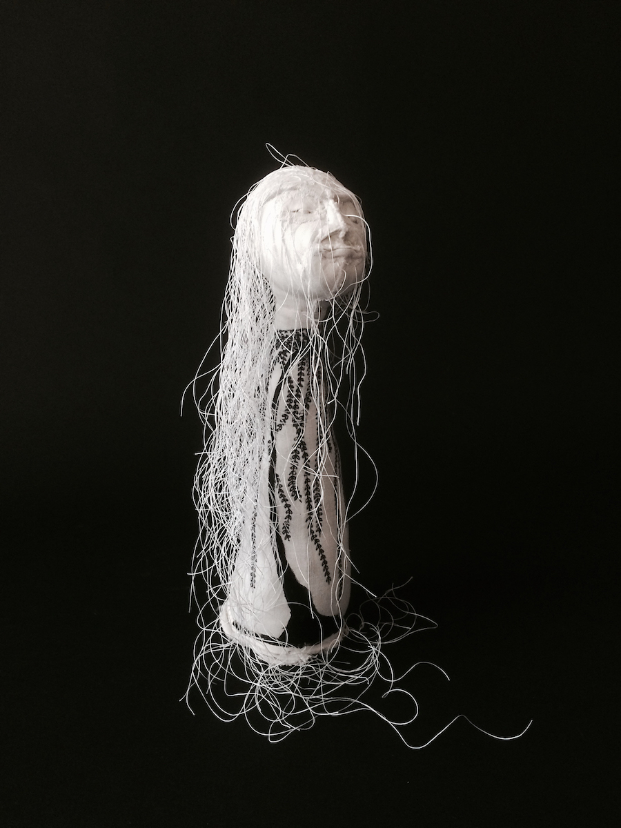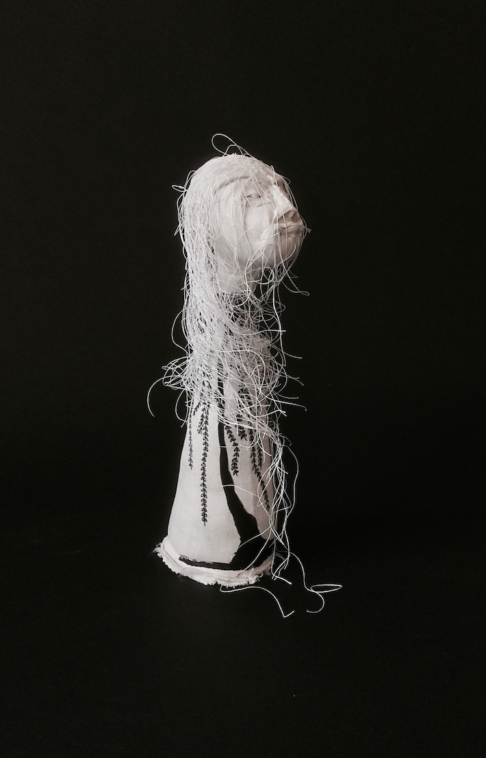 Sculpture textile en drap de métis blanc recyclé, broderie à la main fil de lin blanc, tatouage dessin saule, regard méditation, intérieur en coton, série des « âmes tatouées »,blanc et noir, 24 cm.