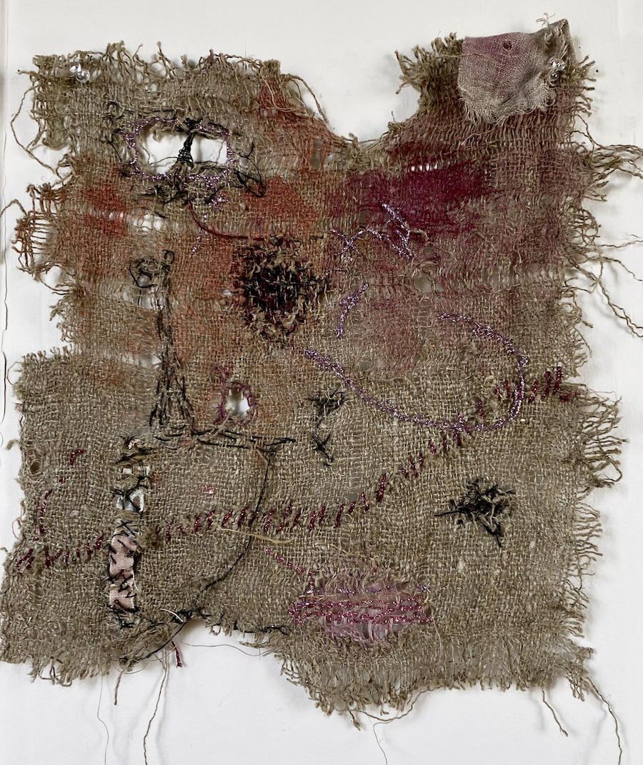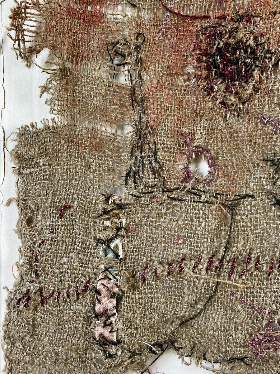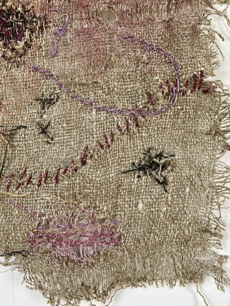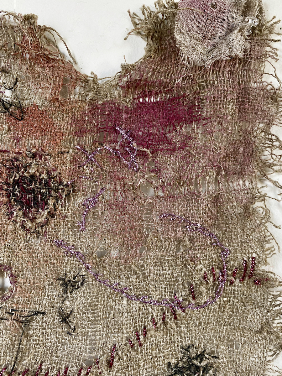 - Étiquettes: Art brut, fils de jute, broderie main, jute recyclée, tissus recyclés, transformation, lurex, réparer, relique.