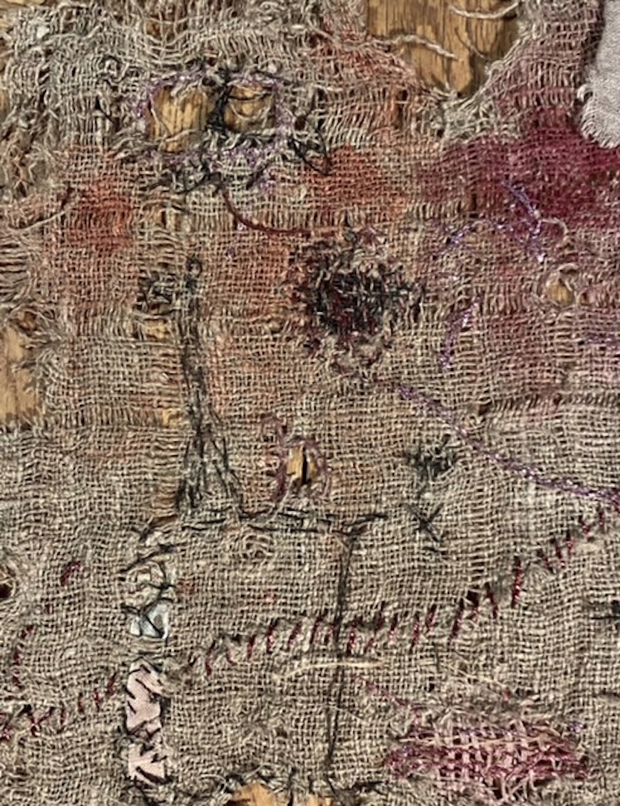 Pour réaliser cette guenilles 3 art brut textile, j’ai jeté mon dévolu sur 2 morceaux de jute abimés et un bout de gaze de lin pour les accompagner. Ainsi, je les assemble, les ra-commode, les rapièce, je rafistole et répare. Je brode aussi .Pour ajouter un peu de magie et de raffinement, j’utilise à la fois des fils de lurex, et des fils plus bruts. Je les transforme , ce sont mes petites reliques!