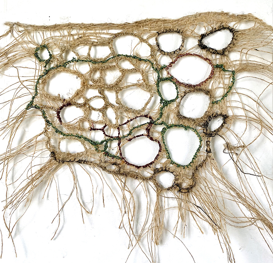 Matérialiser le concept de l’espace, en transmutant la toile de jute recyclée brut en de la dentelle, broderie main, 38×26 cm, 210 €