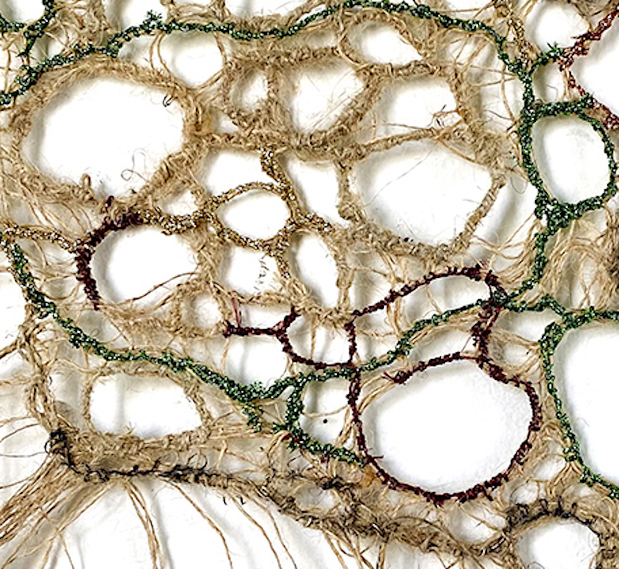 Art textile, transmutation de la jute à la dentelle, broderie à la main, « L’appel du printemps », 95×85 cm avec franges, 560 €