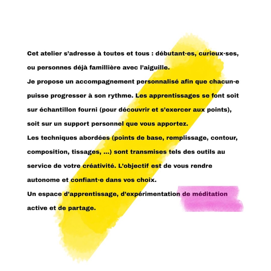 Les techniques abordées (points de base, remplissage, contour, composition, tissage…tant de possibilitési) sont transmises comme des outils au service de votre créativité. L’objectif est de vous rendre autonome et confiant·e dans vos choix.