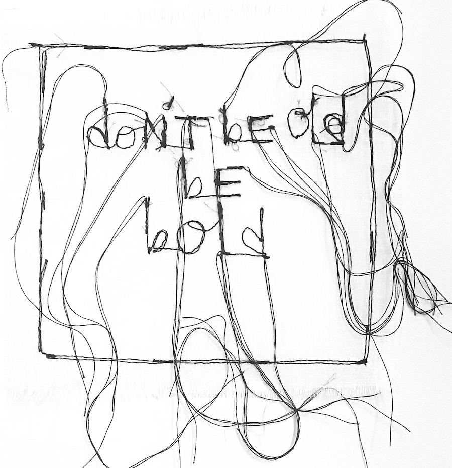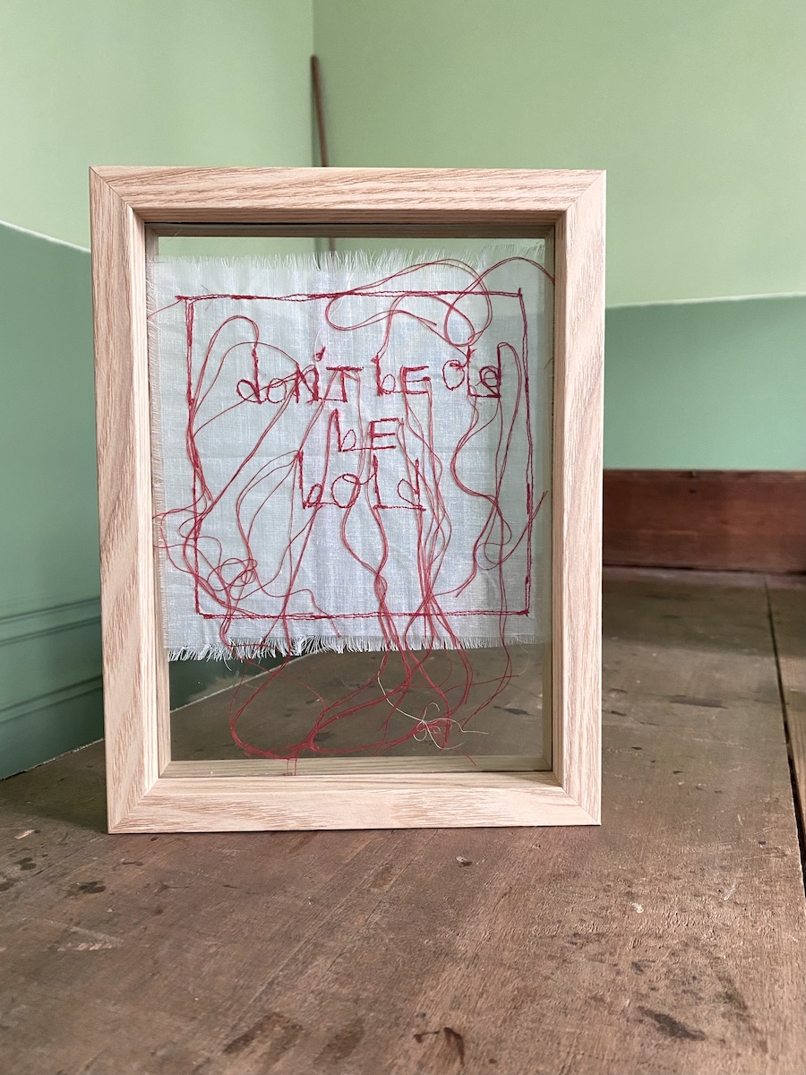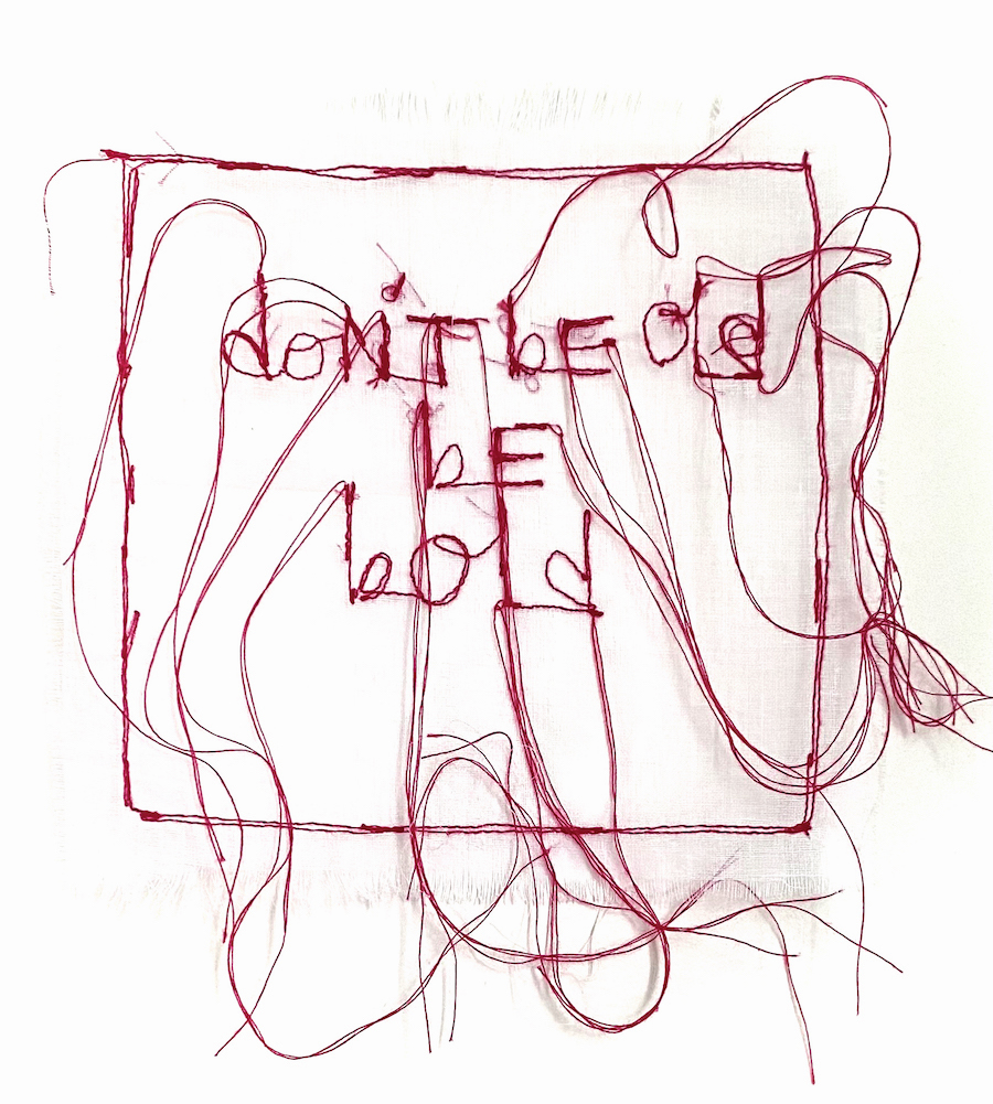 J’ai piqué les mots « don’t be old, be bold » en utilisant une machine à coudre normale. En revanche, je couds sans pied de biche. Je laisse l’aiguille libre. Ainsi je peux faire tournoyer le tissu autour de l’aiguille dans tous les sens. J’obtiens ainsi une couture volontairement irrégulière, et parfaitement imparfaite. Je crée de longs fils qui tombent des lettres. Je me sers de fils de coton sur un léger organdi blanc. Cette broderie « Be bold broderie rouge trouve bien sa place entre deux verres par exemple. Chaque exemplaire est unique car fait manuellement et présente ses propres particularités.