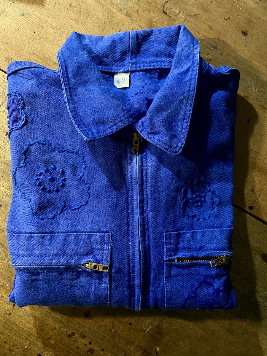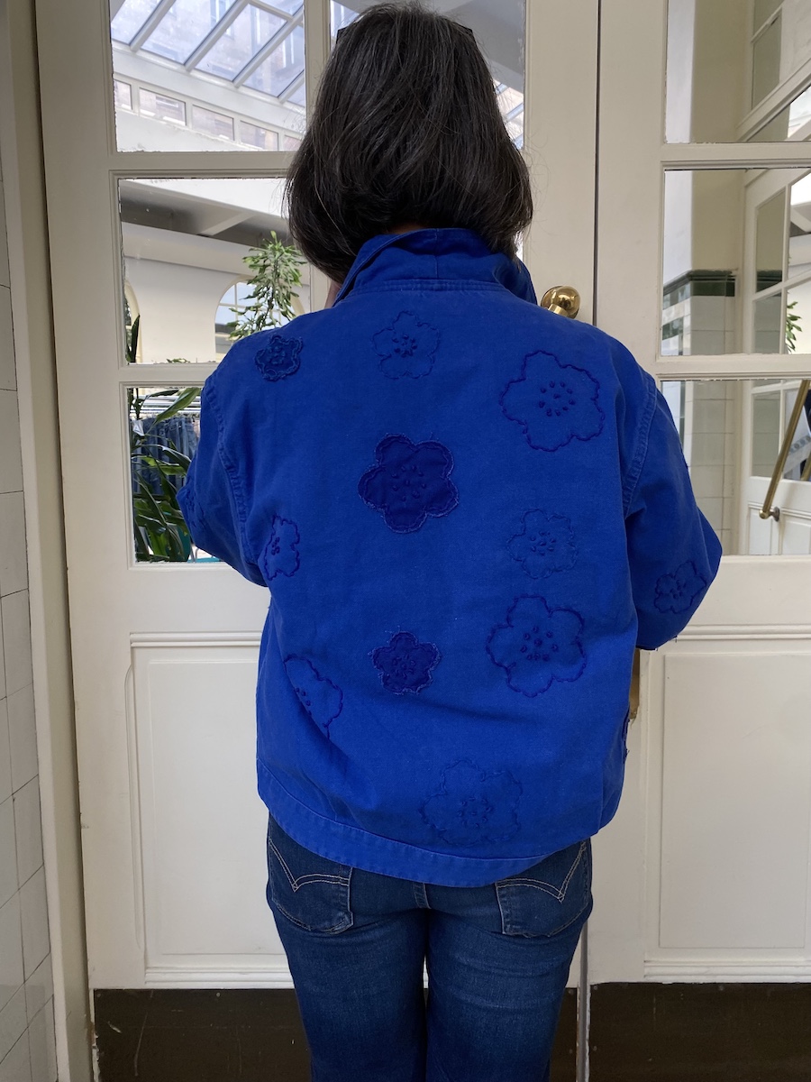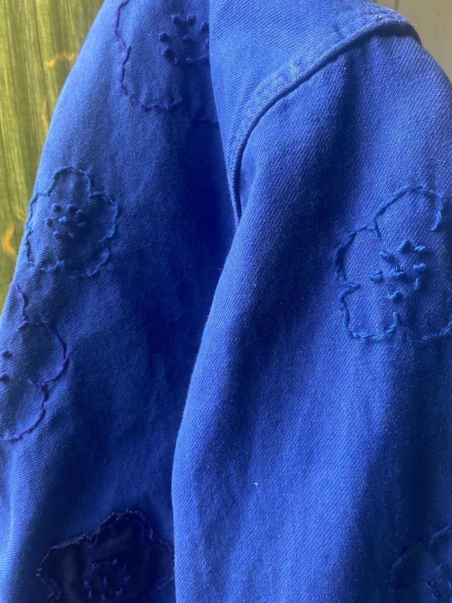 Je procède d’abord au dessin du motif dans mes trois tailles qui seront les patrons. De cette façon, je reporterais certaines sur deux tissus de cotons cobalt et marine, les autres je les trace au fur et à mesure sur le blouson. Pour l’upcycling, je brode au point droit les contours des fleurs. Puis je repasse le fil en l’enfilant dessus dessous . Avec ce procédé, je donne du volume à la broderie, faisant ressortir les tonalités de bleu. Peu à peu, le blouson commence à ne plus se ressembler, son style change. Pour le coeur des fleurs, je brode avec le point de noeud. Lui aussi confère du relief au tissu, relevé par les différentes teintes bleues. Au final, une métamorphose s’est opérée! Gràce à l’upcycling, bloom up est une nouvelle pièce prête pour sa nouvelle vie. En choisissant ce blouson, vous luttez comme moi contre l’obsolescence des tissus Et contre la fast fashion et pour la Terre. Une manière aussi d’honorer les traces du temps et de célébrer l’imparmanence, et la renaissance.