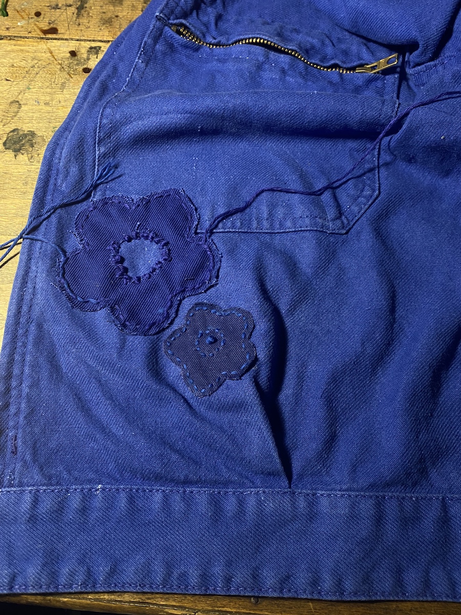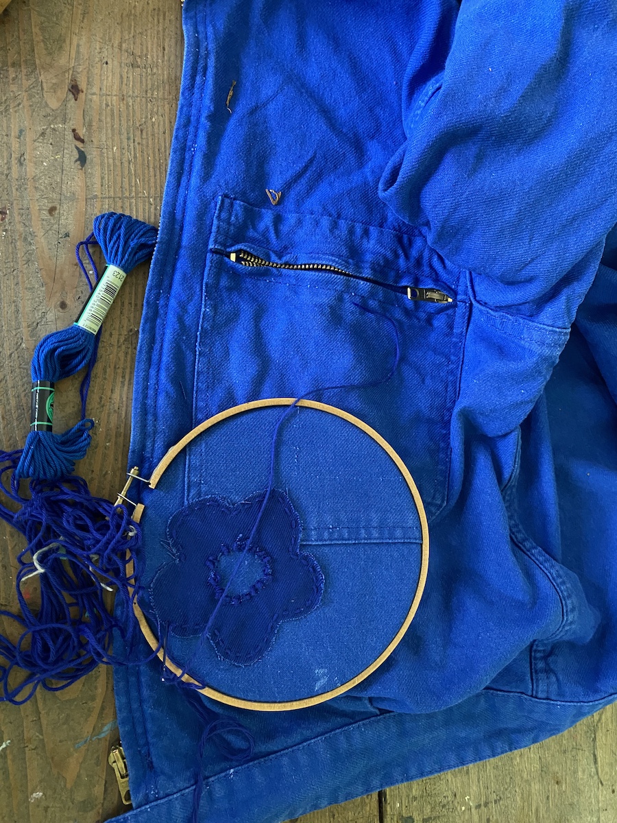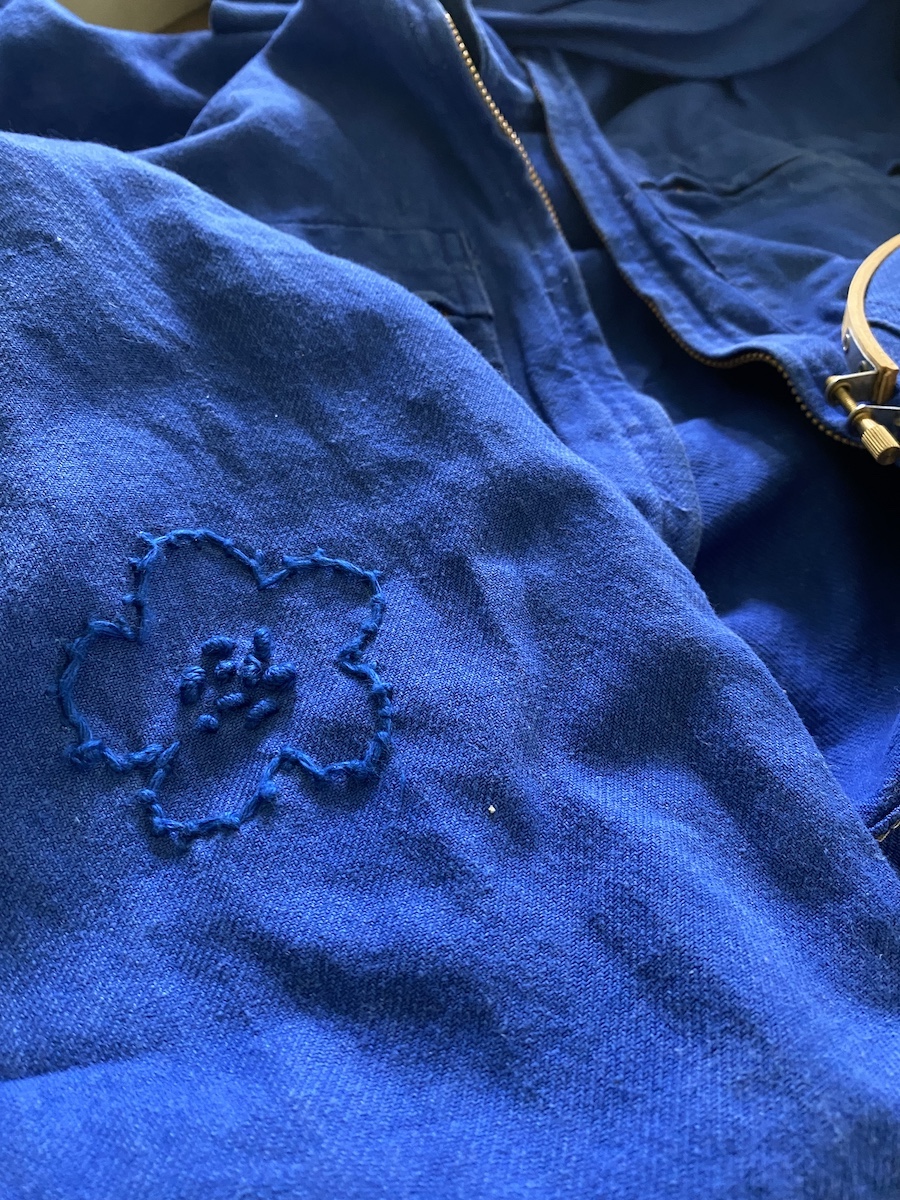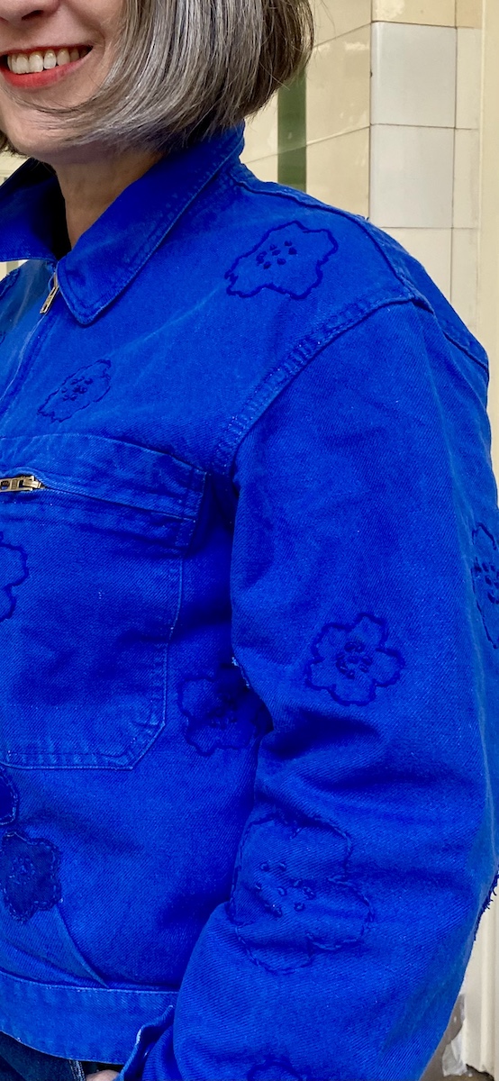 Je procède d’abord au dessin du motif dans mes trois tailles qui seront les patrons. De cette façon, je reporterais certaines sur deux tissus de cotons cobalt et marine, les autres je les trace au fur et à mesure sur le blouson. Pour l’upcycling, je brode au point droit les contours des fleurs. Puis je repasse le fil en l’enfilant dessus dessous . Avec ce procédé, je donne du volume à la broderie, faisant ressortir les tonalités de bleu. Peu à peu, le blouson commence à ne plus se ressembler, son style change. Pour le coeur des fleurs, je brode avec le point de noeud. Lui aussi confère du relief au tissu, relevé par les différentes teintes bleues. Au final, une métamorphose s’est opérée! Gràce à l’upcycling, bloom up est une nouvelle pièce prête pour sa nouvelle vie. En choisissant ce blouson, vous luttez comme moi contre l’obsolescence des tissus Et contre la fast fashion et pour la Terre. Une manière aussi d’honorer les traces du temps et de célébrer l’imparmanence, et la renaissance.