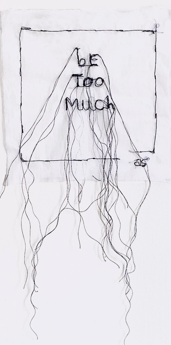 J’ai brodé cette goutte de conscience à l’aide d’une machine à coudre classique. Excepté que je couds sans pied de biche. Ainsi je peux manoeuvrer avec aisance le tissu autour de l’aiguille. Avec cette technique, je peux réaliser des broderies irrégulières, et rendre les coutures plus intéressantes. Je suggère de poser à même le mur ces mémo comme des post it à l’aide de la pâte à fixe. Vous pouvez aussi les encadrer, entre deux-verres pour en préserver la subtile transparence. Ou bien dans un cadre doté d’un fond blanc. Je livre et présente la broderie « Be too much » sous une enveloppe translucide avec une petite carte.
