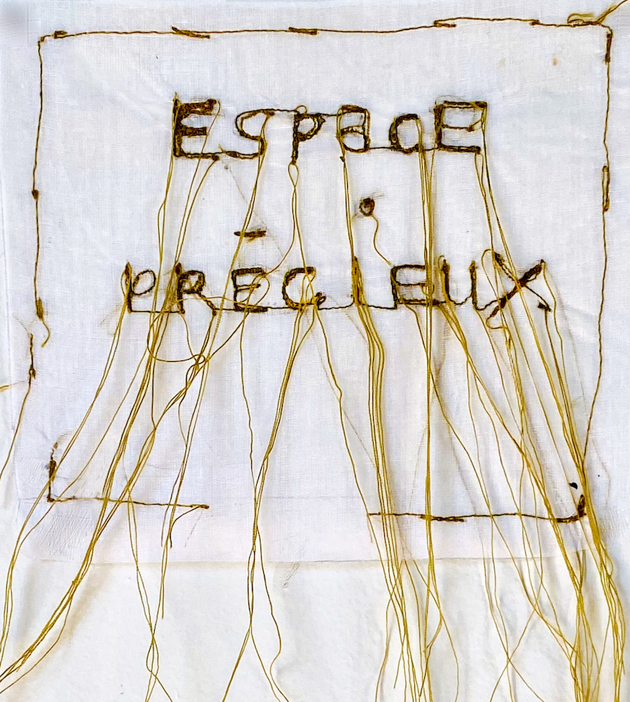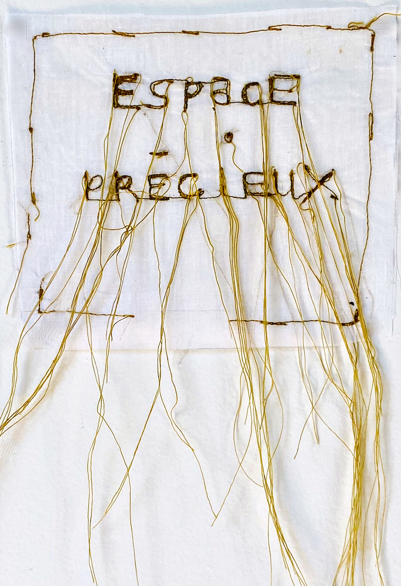 Broderie, goutte de conscience, »Espaces précieux » petite note tel un mémo. Piqûre à bras libre ocre sur de l’organdi blanc, se préserver de l’espace, 14×14 cm