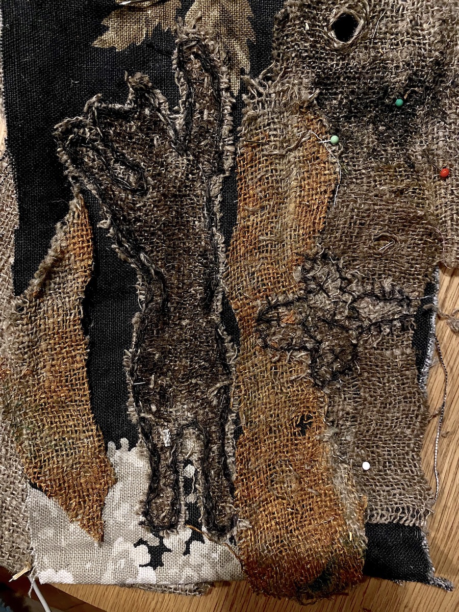 Ainsi pour réaliser cette tapisserie brodée, j’ai utilisé la technique de superpositions de tissus. Les chutes de jutes sont lavées et teintées naturellement autant possible. J’effectue les teintures à la mains, à l’aide de café, thé, brou de noix. En revanche, l’or ocre de la terre est une teinture achetée. La tapisserie se crée au fur et à mesure, je brode quelques heures et fais des pauses. Et ces pauses qui peuvent être plus ou moins longues, sont essentielles à l’évolution de l’oeuvre, et font partie selon moi du processus créatifs. La broderie est réalisée avec les fils de jutes teintés au préalable ou naturels. J’ai utilisé la technique de rapiéçage japonaise appelée sashiko. Mais également le point de chainette, et le point d’épines.