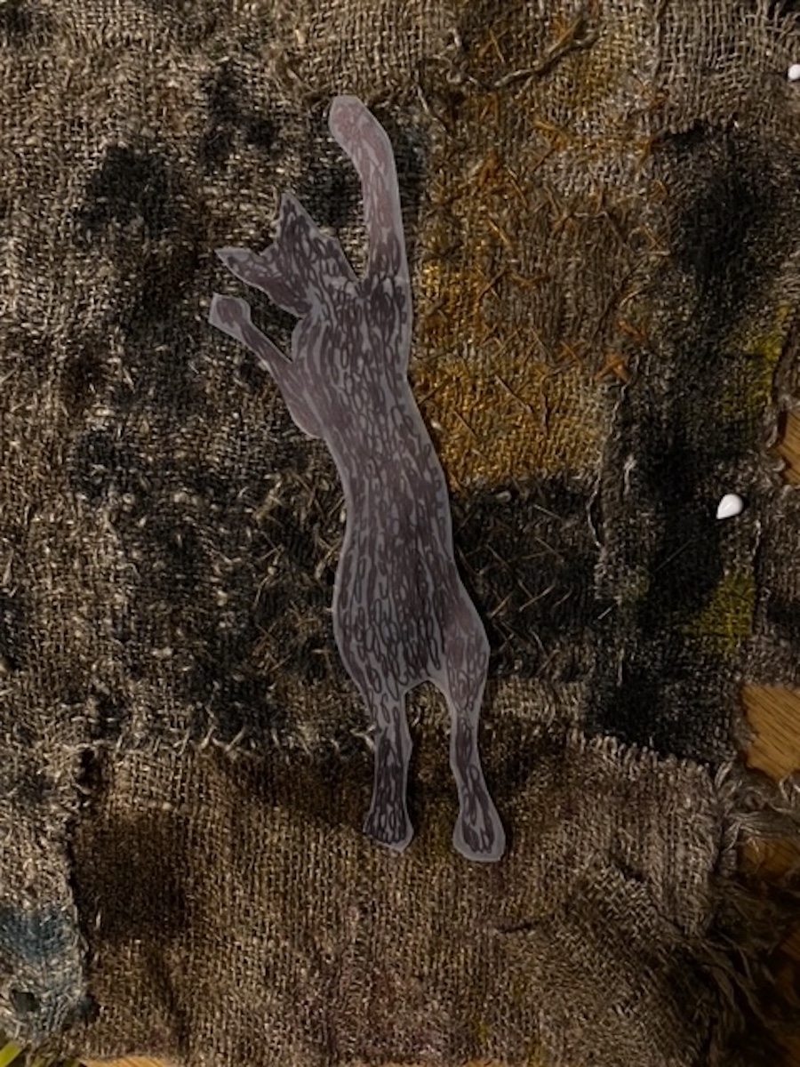Cette broderie tapisserie superpositions que j’ai nommée « Loulou sama » est une oeuvre brodée de la série « Les humeurs de la terre » art brut. Et j’ai imaginé rendre un hommage à la terre, la terre et ses saisons, la terre et ses couleurs, la terre comme ancrage. Nous sommes à l’automne, je m’activais dans le jardin les mains pleines de terre. Et mon chat Loulou sama, qui jouait toujours alentour, cette année manquait à l’appel. C’est donc tout naturellement qu’il est arrivé dans la broderie. C’est donc un hommage à la terre et un hommage à mon chat.