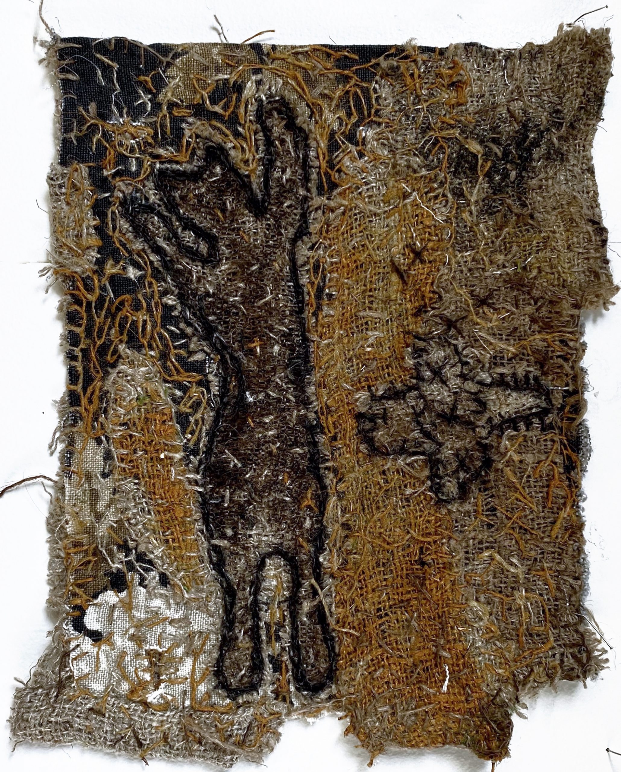 Petite guenille magnifiée, chutes recyclées et broderies 39×26 cm.