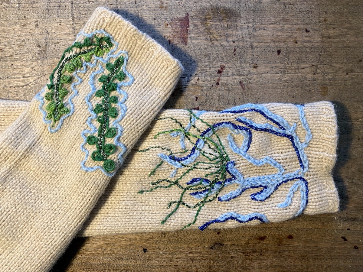 Je vous montre avec ses broderies sur cachemire comme exemple des algues. La broderie à la main est une promenade lente de l’aiguille dans le support. Avant de débuter les broderies à la main sur le cachemire, je dessine sur papier , ici les algues. Une fois l’illustration réalisée, plusieurs options existent pour reporter le dessin sur la cachemire. Pour ma part, je brode directement, sans traçage sur la laine. Pour cela je garde l’illustration face à moi. Cependant, il est possible d’utiliser un toile thermocollante sur laquelle l’on reporte le motif. Je n’utilise que rarement cette option. En effet je préfére avoir vue sur la matière et sa couleur. Car, même si je connais ma gamme de couleurs avant de me lancer, j’aime choisir au fur et à mesure le fil à broder. Cela me permets d’inventer au fur et à mesure les broderies, et d’ajouter ou remplacer des couleurs. Pour ces broderies sur cachemire, j’ai travaillé les algues avec des fils de laine et de lurex. Le prix de cet exemple concerne les broderies sur laine ou cachemire et inclu les fils utilisés. Il peut en effet différer selon l’épaisseur des fils.
