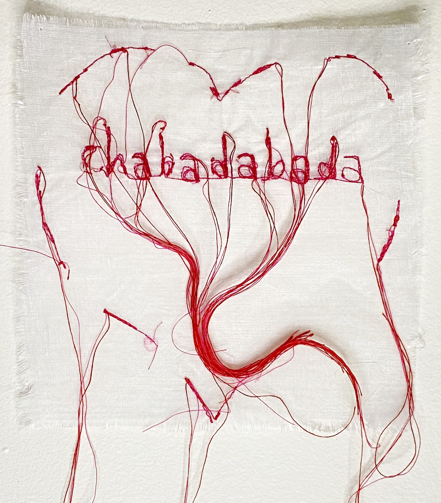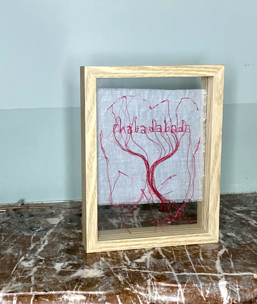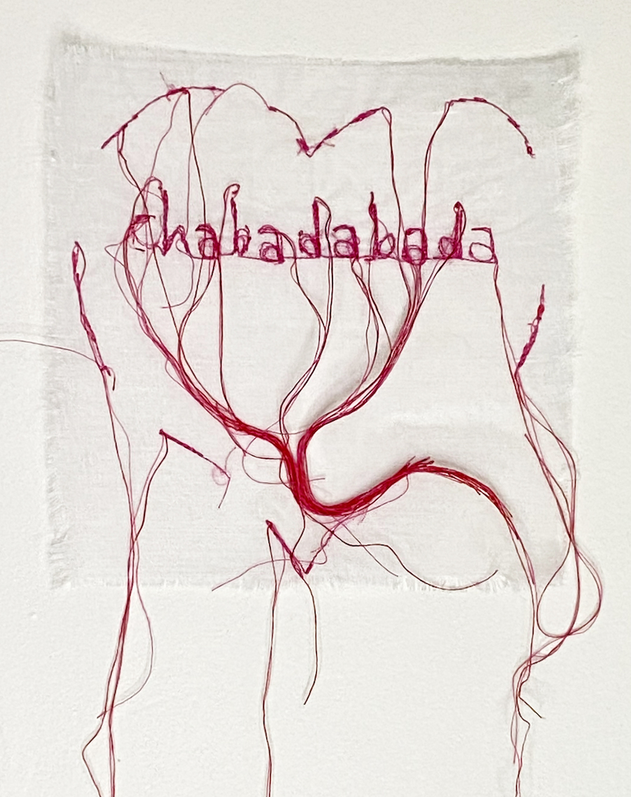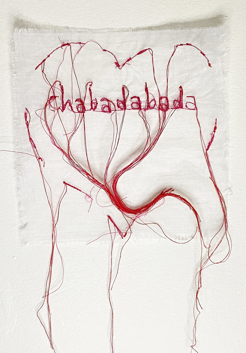 J’ai piqué à bras libre au fil de coton « Chabadabada broderie fougueuse » sur un léger et évanescent organdi. Je couds ces invitations à l’aide d’une machine à coudre normale. Cependant, en lui ôtant le pied de biche, j’ai plus de liberté pour réaliser des coutures irrégulières. Car je peux faire tourner le tissu avec plus d’aisance sous l’aiguille et obtenir un rendu un peu maladroit. Quand aux longs fils suspendus de chaque lettre, je les ajoute une fois les mots brodés. Présentés sous enveloppe translucide et petite carte.