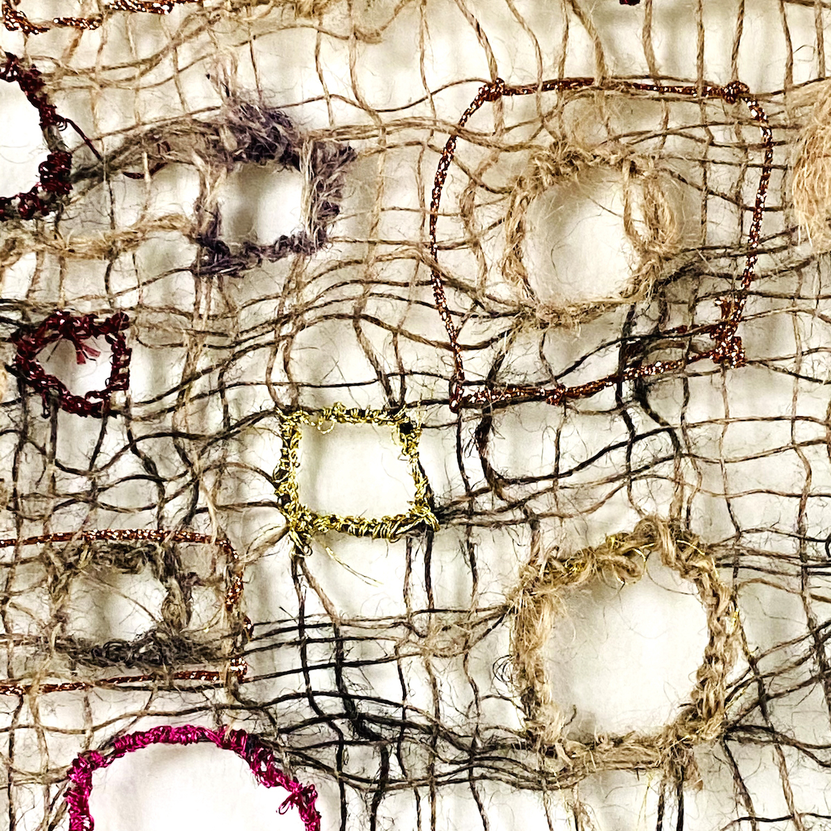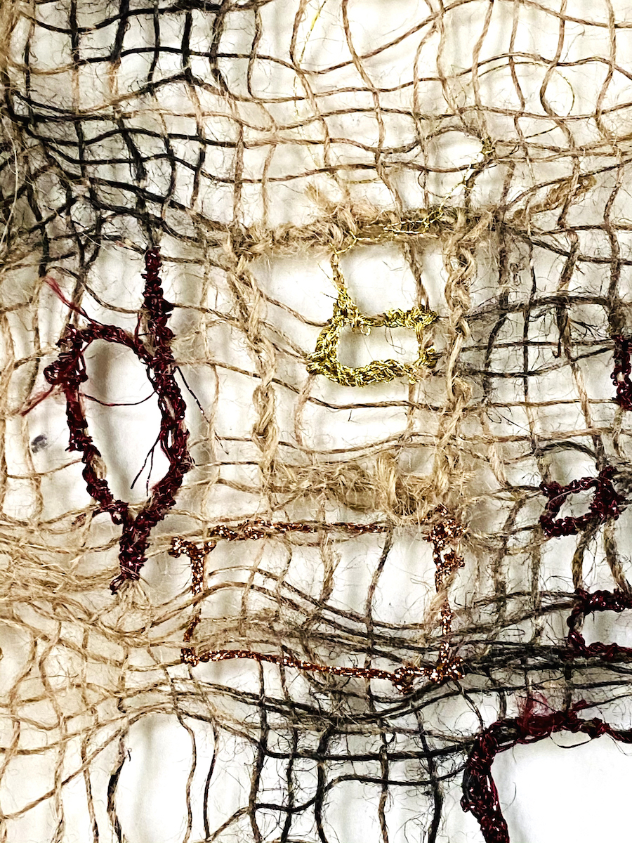 Les fils que j’ai utilisés sont des fils de jute teints ou naturels, et des fils de lurex rose, pourpre et or. La toile de jute devient elle même plus précieuse comme de la dentelle. Je propose d’encadrer cette broderie dans un cadre vitrine entre deux- verres.