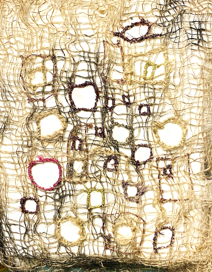 Et j’ai choisi de le matérialiser en broderies. Pour cela j’ai pensé utiliser la toile de jute. Ainsi pour représenter la notion d’espaces , j’ai créé des brèches dans la toile de jute, en variant formes et tailles . Puis autour de ces « espaces précieux », à l’aide de fils de jute brutes et de fils plus nobles de lurex, je brode pour les maintenir en place. Au delà du fait que j’apprécie particulièrement le mixage de matières opposées, en délimitant de fils de lurex plus raffinés quelques « vides » j’insiste sur la nécessité et la valeur des ces « espaces précieux ».