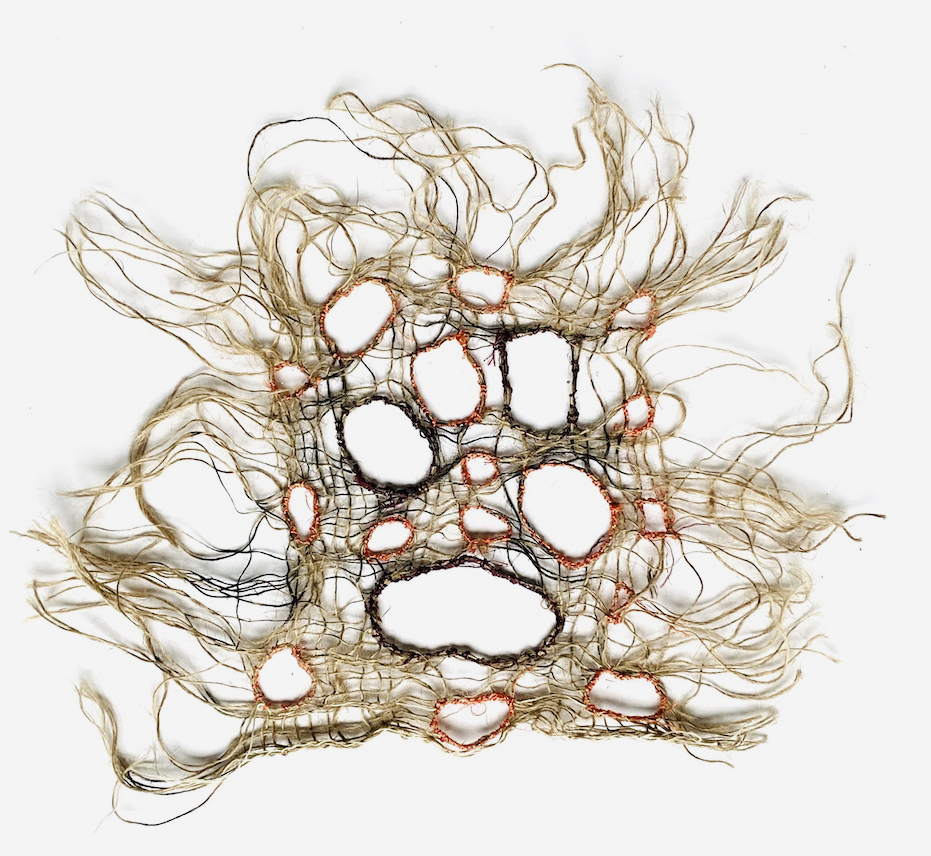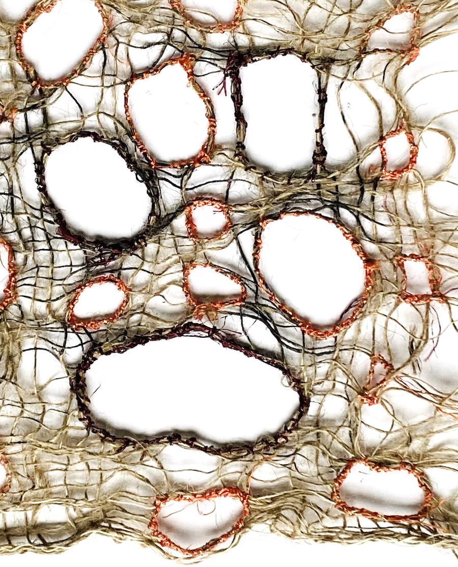 Art textile, transmutation de la jute à la dentelle, broderie à la main, « L’appel du printemps », 95×85 cm avec franges, 560 €
