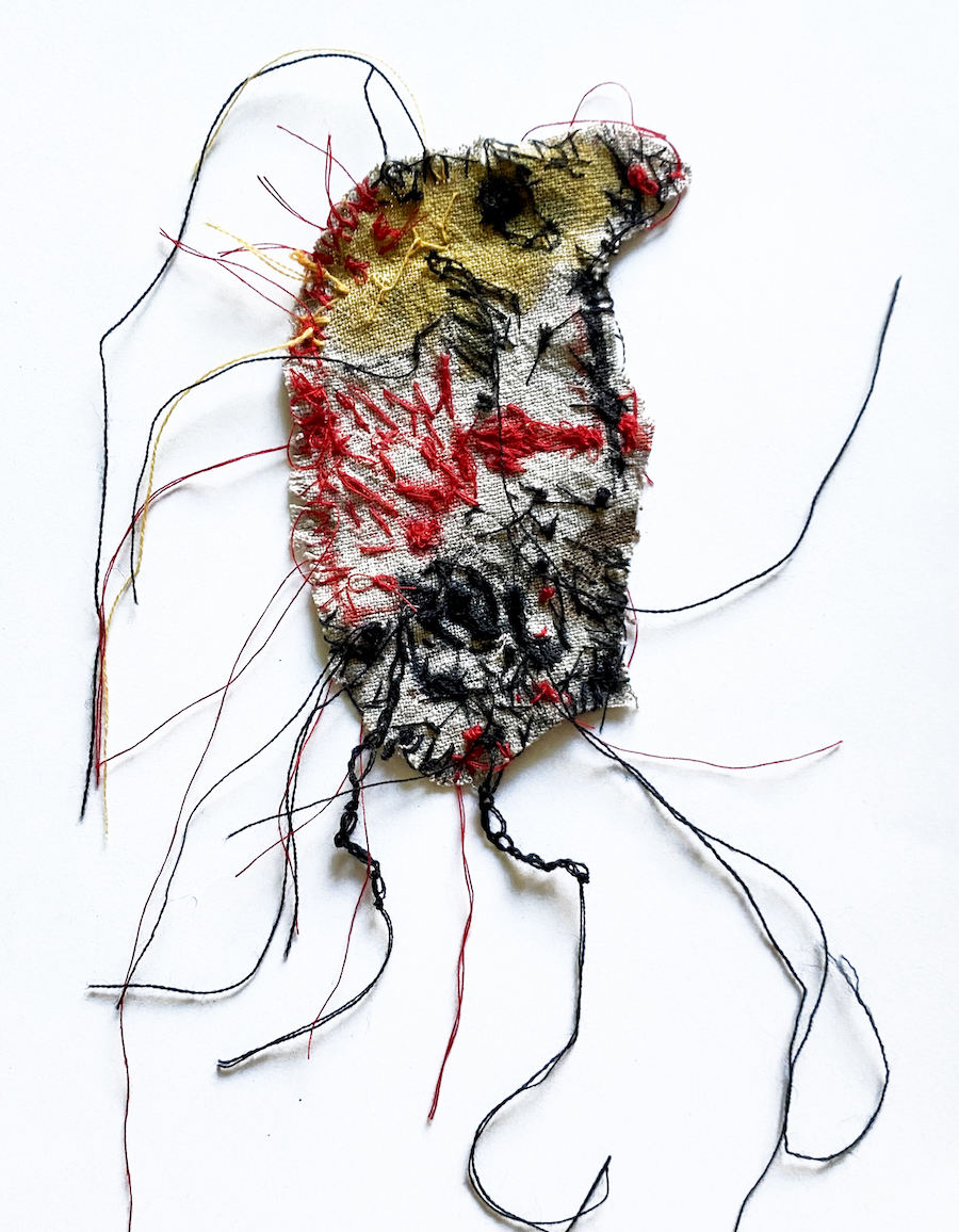 J’ai imaginé cette Fioriture broderie abstraite, « Houle à l’âme » classée dans la série des « Petits fragments émotifs ». En effet lorsque nous vivons, à chaque instant nous ressentons. Émotions et vie ne se baladent pas l’un sans l’autre. Petit rappel l’émotion étant un état affectif de plaisir et/ou de douleur, autrement dit un vent plaisant ou déplaisant. Et que le bouillon soit inconfortable au possible ou joyeux, je m’entraine à l’apprécier pour ce qu’il est. Un jour, d’un tiroir dédié, j’ai choisi un fragment de lin et d’un autre j’ai sorti les encres de chine. (Les broderies naitront plus tard). Je me suis laissée guidée par le rouge de la colère, le noir de la peur et le jaune de la joie.