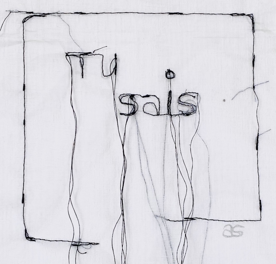 J’ai crée ces broderies à l’aide d’une machine à coudre classique, mais d’une façon particulière. En effet, je retire le pied de biche, qui maintient et guide le tissu lors de la couture. Et cela me permet de manier l’ouvrage dans toutes les directions. Et ainsi je crée des broderies à épaisseurs variées et irrégulières. La broderie goutte de conscience « tu sais » est noire sur de l’organdi léger et blanc.