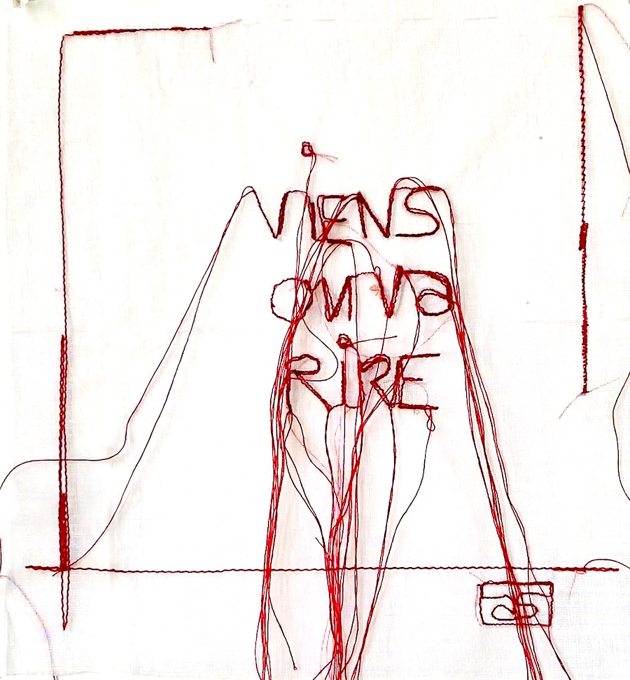 Cette broderie goutte de conscience » viens on va rire » fait partie d’une collection de » mots brodés, invitation à » , ajouter une goutte de conscience dans son quotidien. Un mémo à accrocher au mur, collé ou bien encadré. Dans ce cas je suggère en entre deux verre, car il permet de conservé la transparence du tissu. Cette broderie goutte de conscience ‘viens on va rire » est réalisée à la machine à coudre. C’est une machine classique, de laquelle je retire le pied de biche: je nomme cela piqûre à bras libre. En effet avec cette technique, je peux naviguer dans tous les sens avec mon tissu que je guide. Ainsi, je pique de gauche à droite et de hauts en bas, ou l’inverse. Cela me permets aussi de réaliser une couture différente. En revenant sur certains points je les épaissis, et je provoque une maladresse dans les lignes de broderies et même la provoque! et en plus je laisse trainer et pendre les fils et en rajoute!