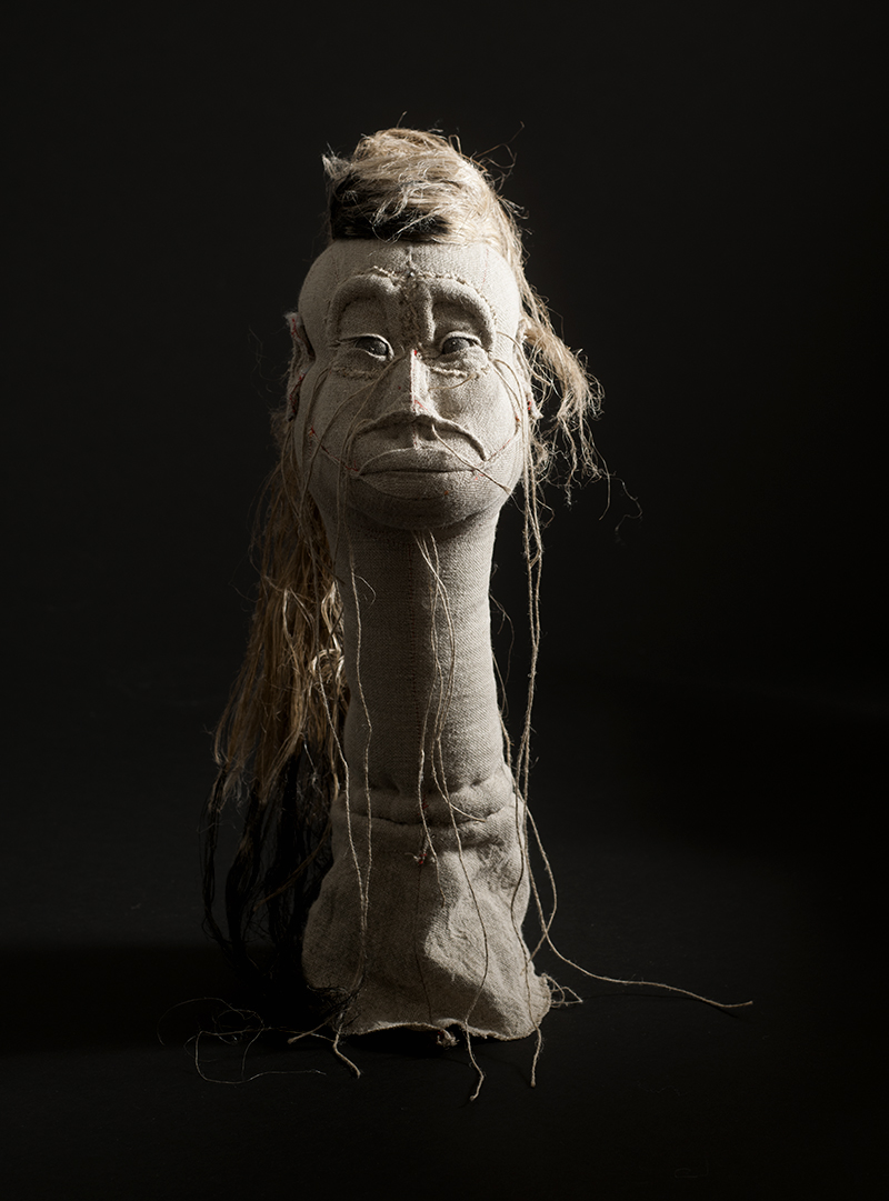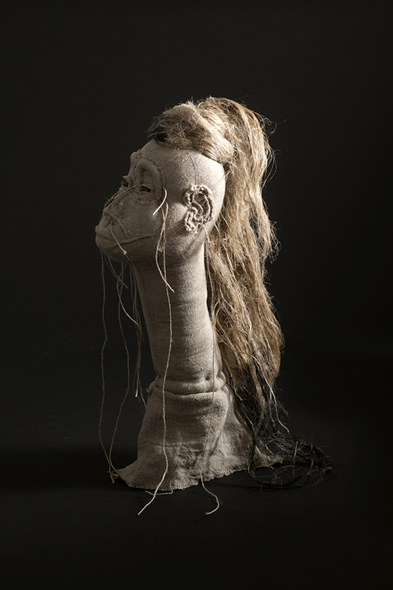 Après cette phase, je dois fixer les volumes maintenus pas les houseaux. Alors, je transperce les épaisseurs de tissu et la ouate à l’aide des grandes aiguilles à double pointes, enfilées de ficelle de lin. À partir de là, j’exerce des tensions plus ou moins fortes selon les creux et les bosses que je désire réaliser. Pour maintenir, fixer ces formes je me sers des noeuds utilisés en tapisserie d’ameublement. Enfin, avec les carrelets, des aiguilles arrondies, j’affine les volumes et donner le caractère du portrait. Le nez, la bouche, les sourcils le menton les oreilles le regard s’affirment petit à petit. Quant à la chevelure, elle est en fils de chanvre naturels, teints parfois en anthracite.