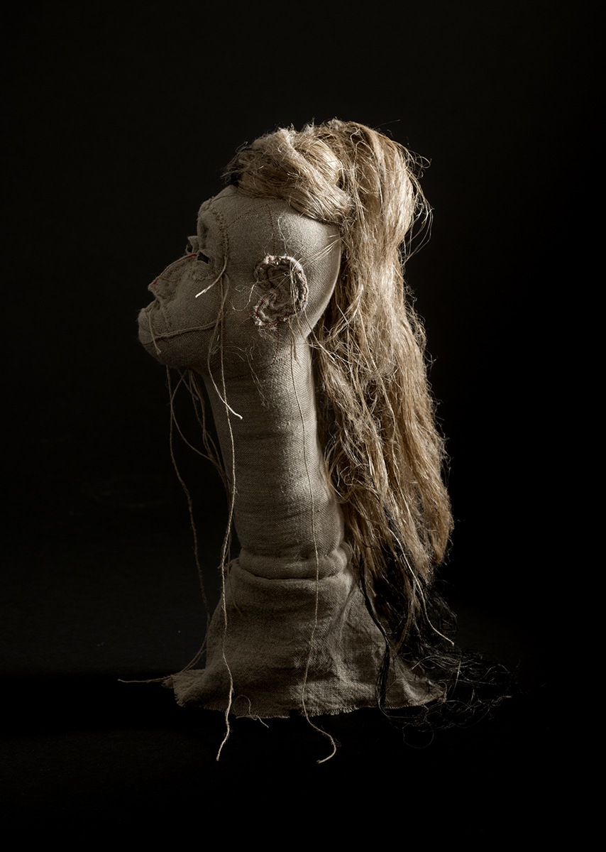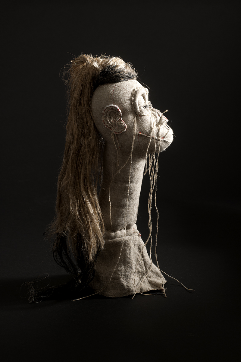 Ce portrait sculpture en art brut textile est réalisée dans à partir de lin style toile de peintre. Pour créer ce portrait , j’ai fait un patron unique à partir d’un dessin préalable. Ensuite j’ai découpé les formes dans le tissu et les ai assemblées. Et voici que j’obtiens un crâne à plat que je rempli de ouate de coton tassé très serré. C’est alors que je vais commencer à sculpter. Et pour cela, j’emploie les techniques du tapissier et quelques outils et également de celles de moulage sur corps. Les houseaux (les grosses épingles de tapissiers), me permettent de manipuler la matière textile. En effet avec ces grosses épingles, je maintiens les tissus et commence à modeler le lin. Notamment je place les pinces, et procède à des découpages, des creux et des pleins commencent à s’ accentuer..