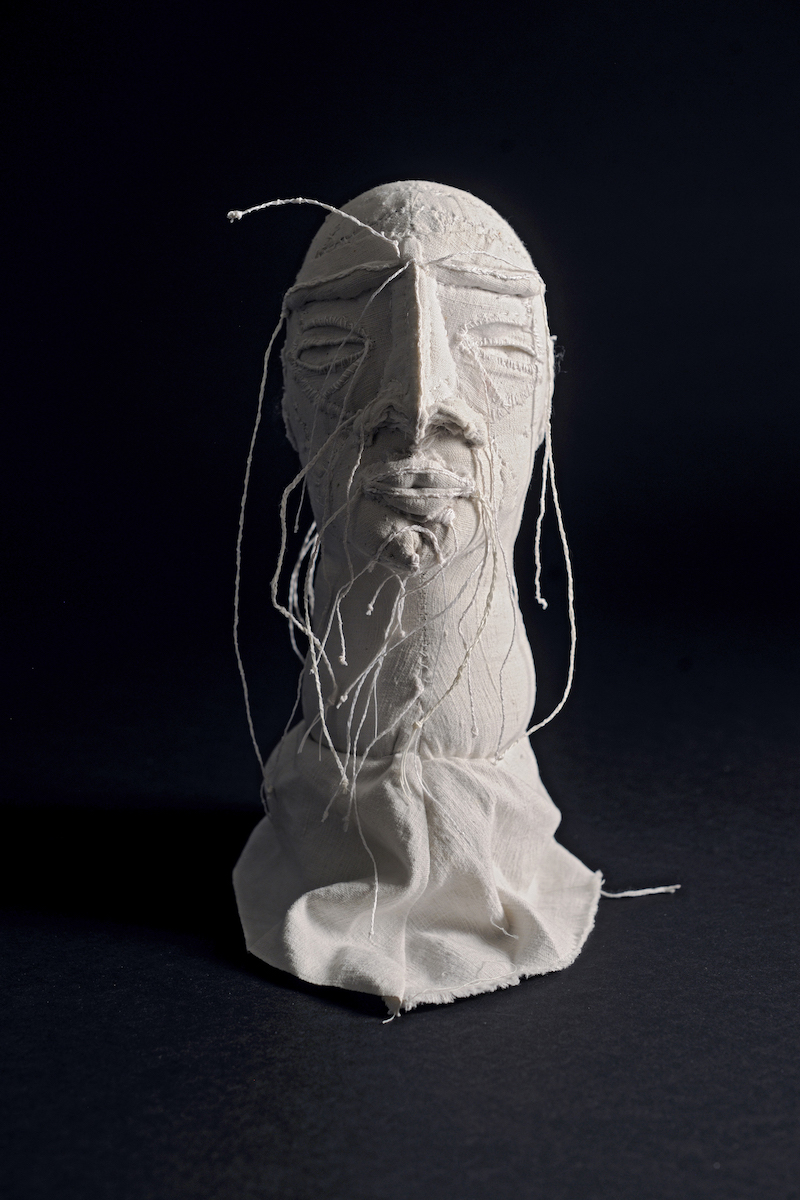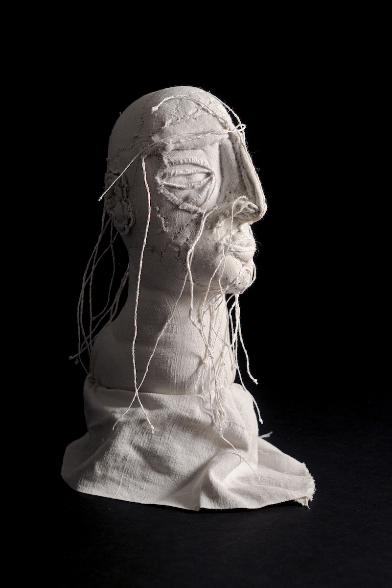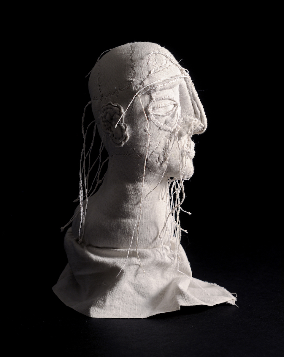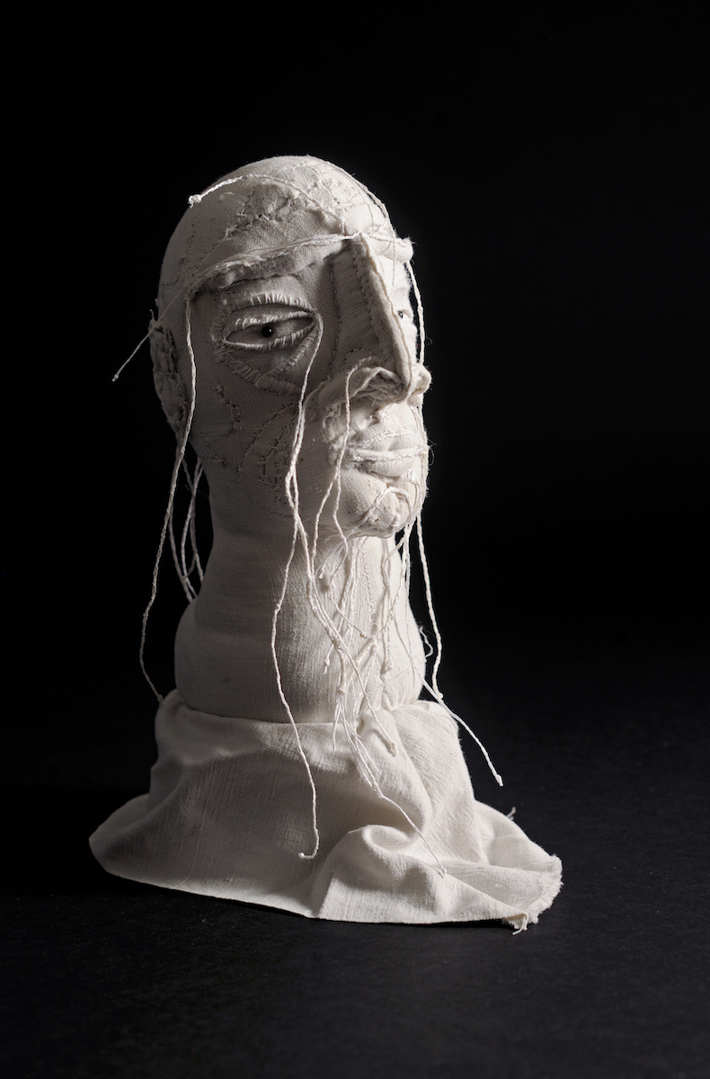 Sculpture, art textile, portrait blanc, illustrant l’état méditatif, tapisserie et broderie à la main, fis de lin blanc, métis recyclé, intérieur en coton, 28 cm.