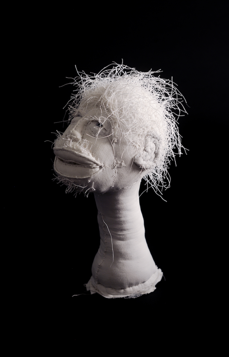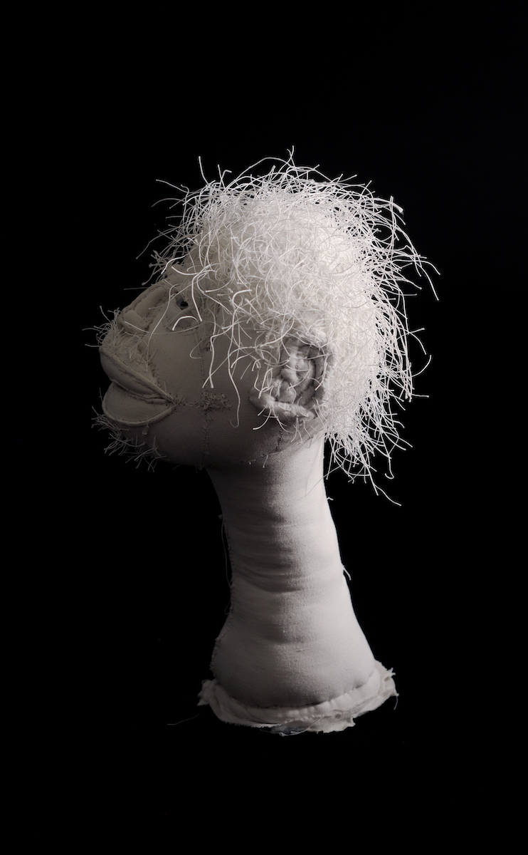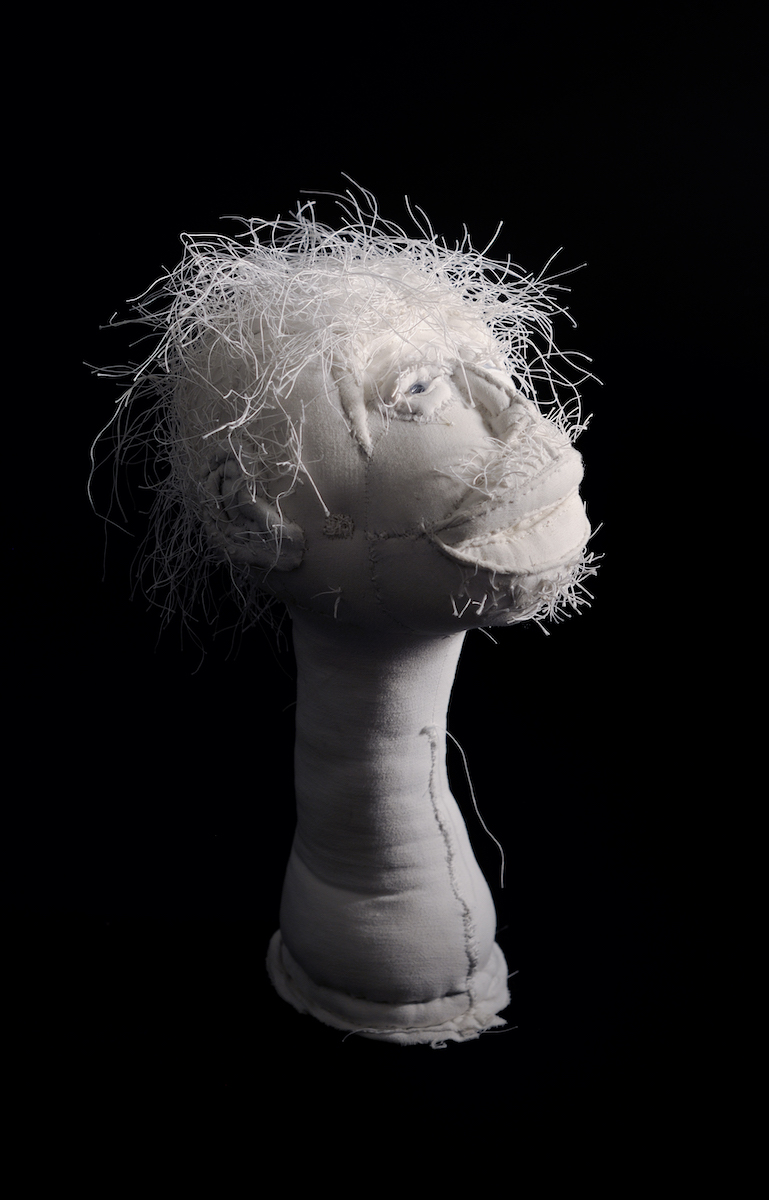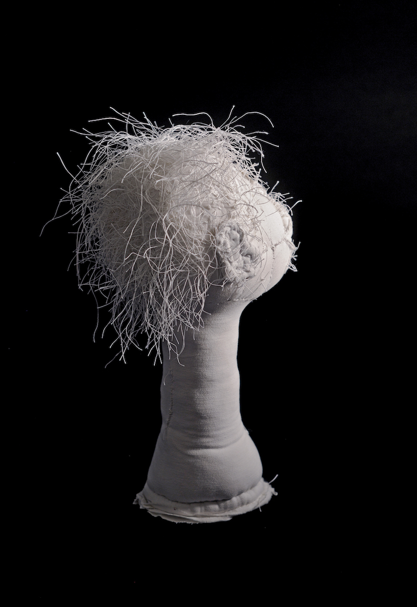 Sculpture, art textile, drap en métis recyclé, portrait blanc illustrant l’état méditatif, tapisserie, broderie à la main, fils de lin, intérieur en coton, 34 cm.