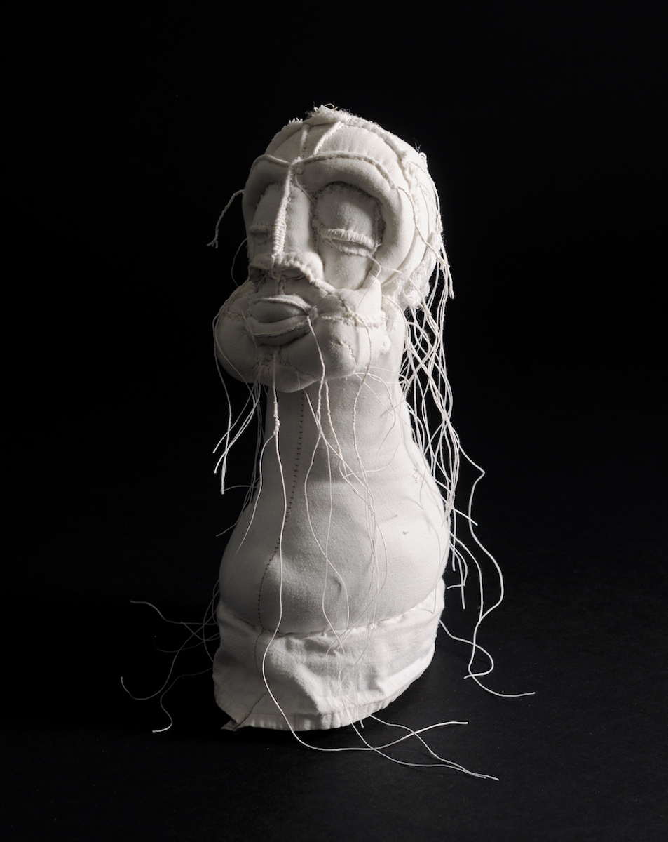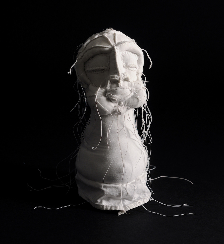 Sculpture, art textile recyclé, portrait blanc illustrant l’état méditatif, tapisserie et broderie à la main, fils de lin, intérieur en coton, 29 cm.