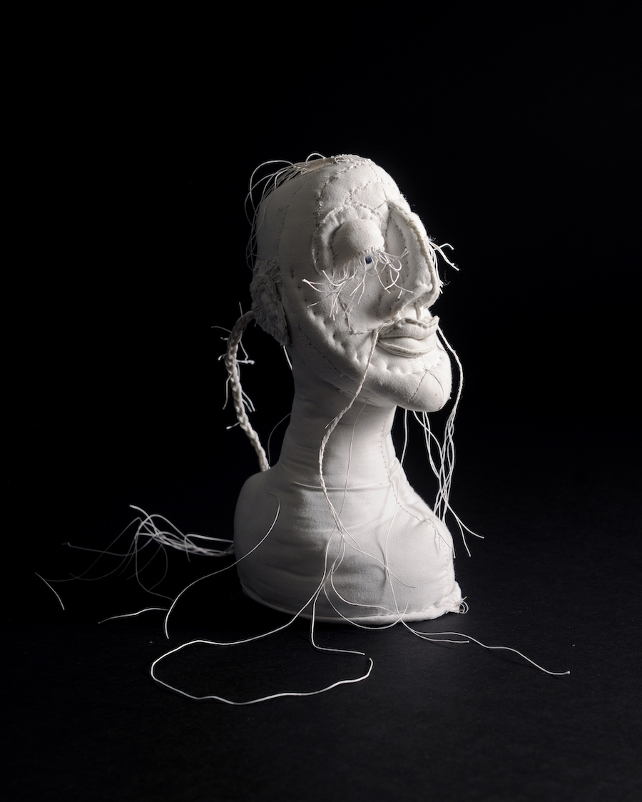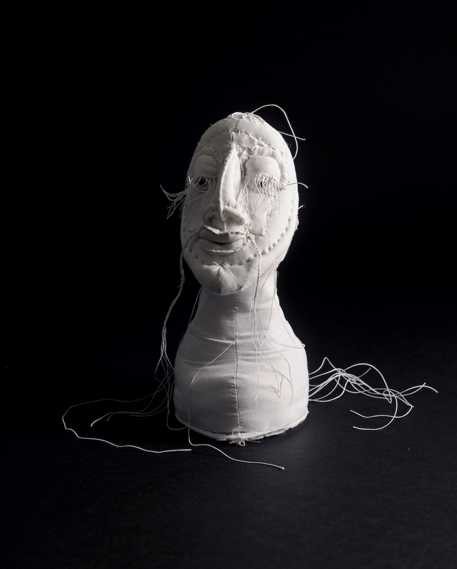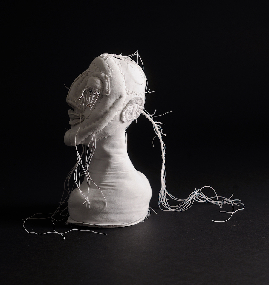 Sculpture, art textile, drap recyclé, portrait blanc, illustrant l’état méditatif, tapisserie et broderie à la main, fils de lin, intérieur en coton, 31 cm.