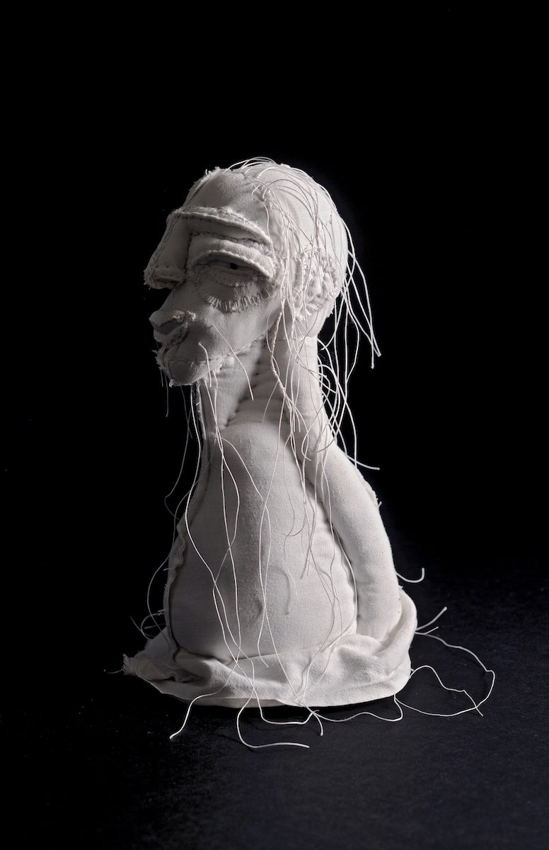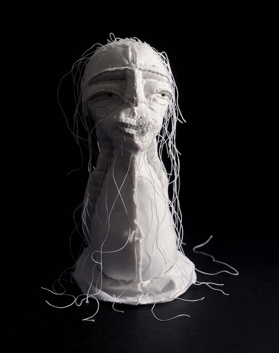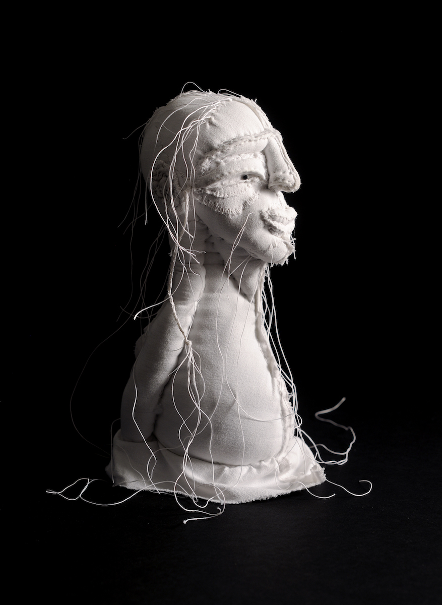 Sculpture, art textile en drap recyclé, portrait blanc d’une âme en méditation, tapisserie et broderie à la main, fils de lin, intérieur en coton, 31 cm.