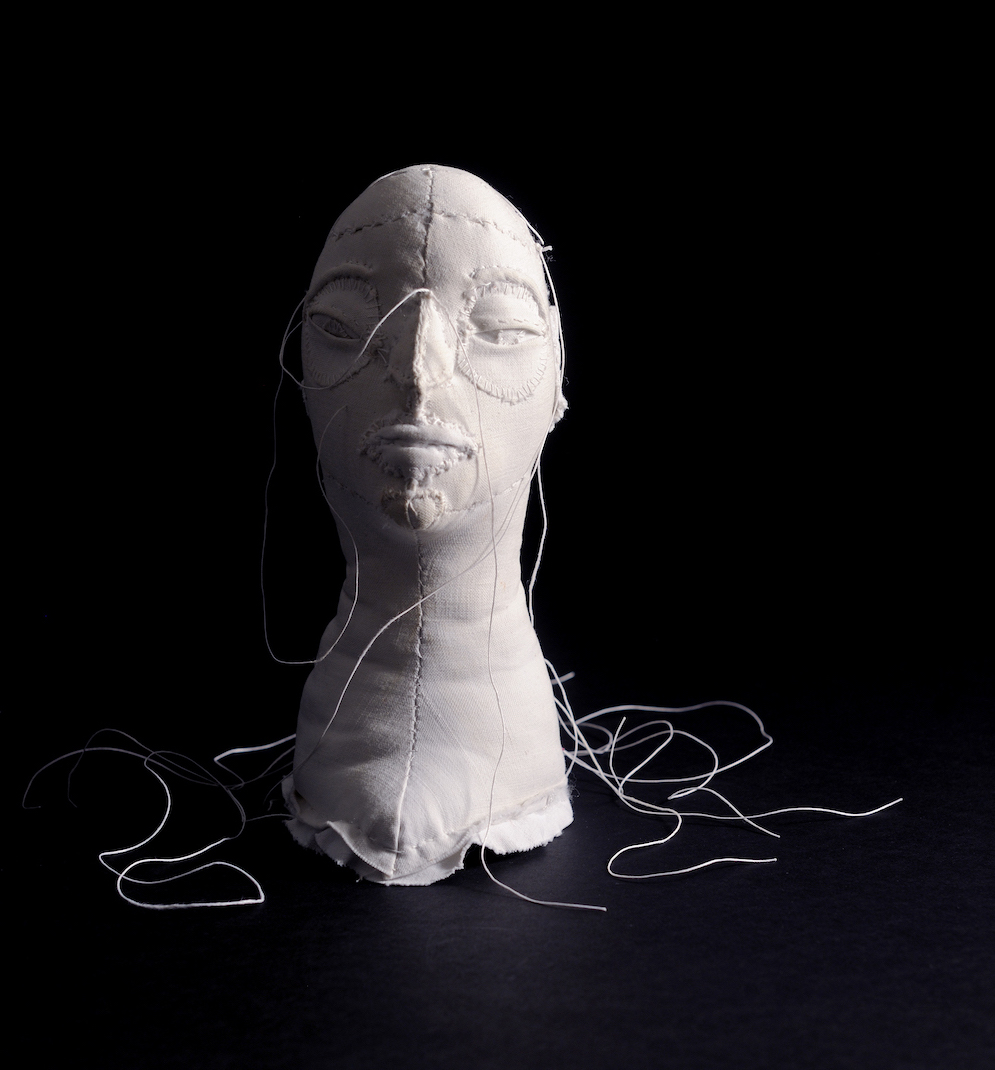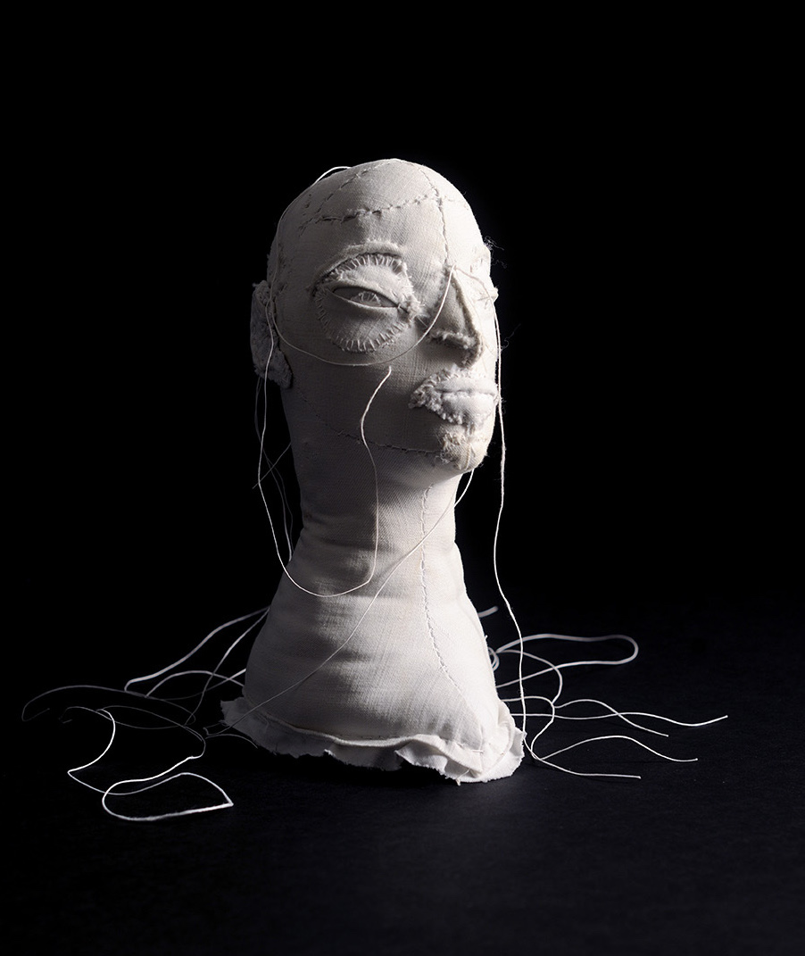 Sculpture, art textile recyclé, portrait blanc illustrant l’état méditatif, tapisserie et broderie à la main, fils de lin, intérieur en coton, 29 cm.