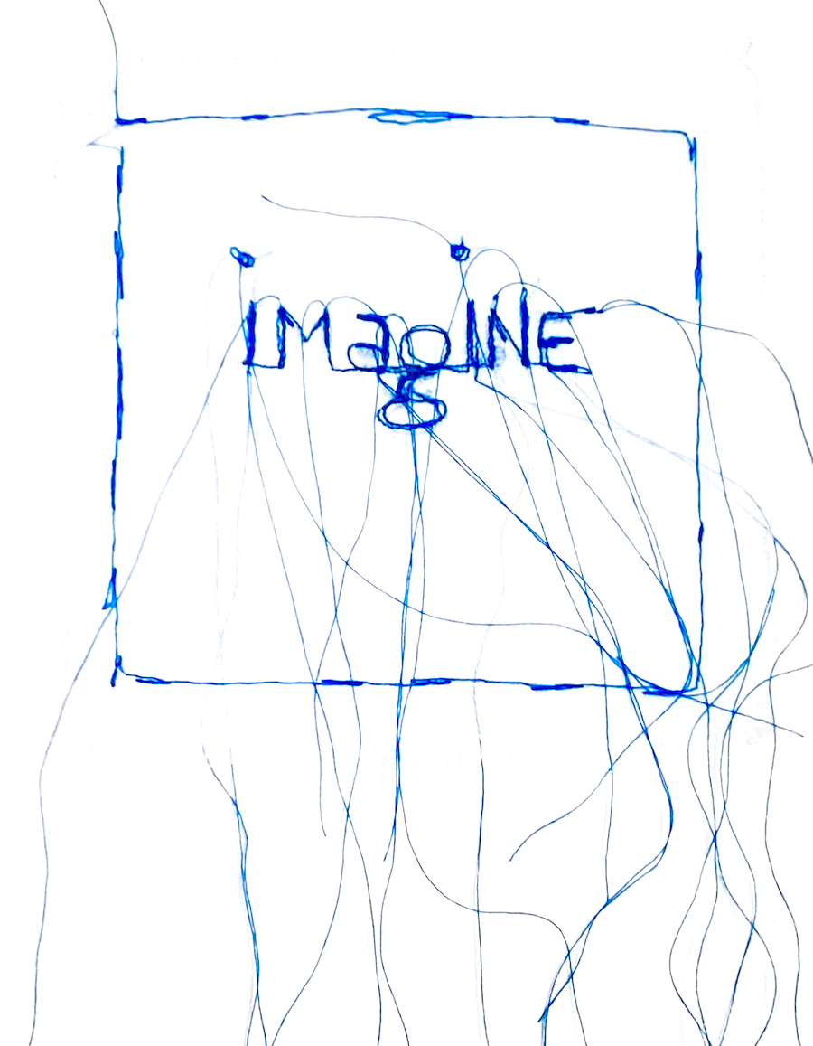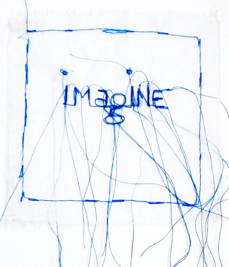 J’ai cousu « Imagine broderie invitation à la paix » sur un léger et évanescent organdi blanc au fil bleu. J’ai exécuté la broderie à l’aide d’une machine très simple et classique. En revanche, je pique sans pied de biche que j’ai retiré. En effet, je brode ainsi plus aisément autour de chaque lettre, et fais danser le tissu autour de l’aiguille. Et cette technique me permets de réaliser une piqûre volontairement maladroite et irrégulière. Elle me facilite également l’ajout de fils que je laisse pendre. Cette goutte de conscience est comme les autres à accrocher à vue, afin d’accéder à toujours plus de présence consciente dans nos vies. En effet, j’ai conçu ces broderies comme des mémos, des alertes quotidiennes, et regarder ces invitations favorise le processus.