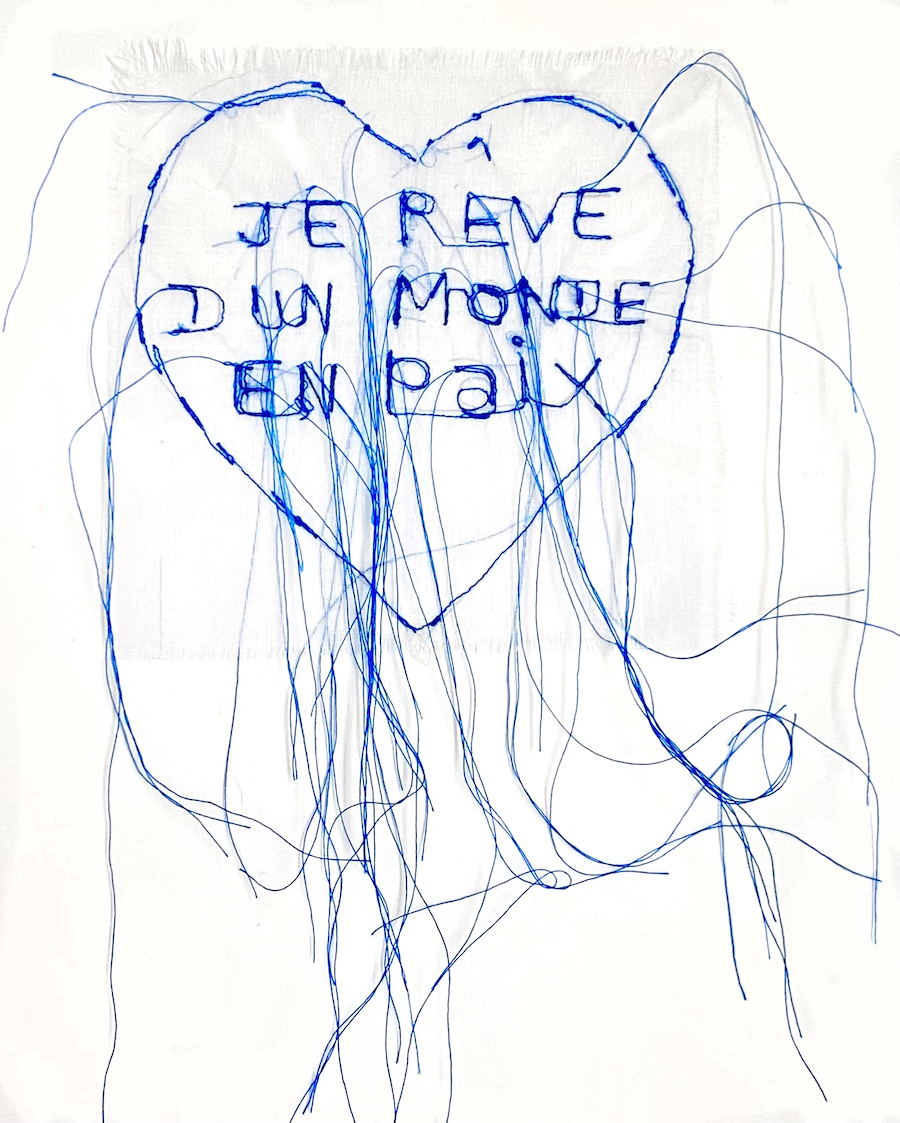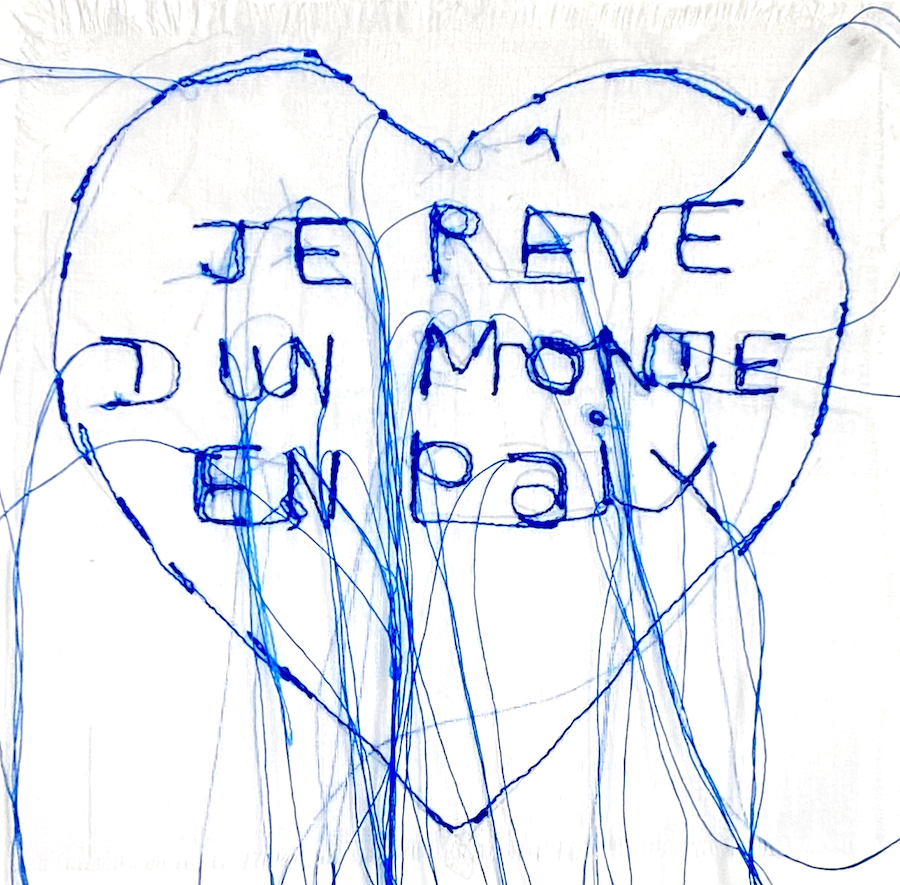 J’ai brodé sur un léger organdi blanc, évanescent à l’aide d’une machine à coudre classique. En revanche, je lui retire le pied de biche. Ainsi je navigue avec les tissu, dans toutes les directions plus facilement. Je couds comme cela la broderie de manière irrégulière, couture que je trouve plus interessante. Le fil est un fil de coton bleu classique. Cette invitation broderie consciente « Je rêve d’un monde en paix » est à considérer tel un mémo, à encadrer ou à accrocher à vue sur le mur. Je suggère un cadre entre deux verres qui permet de garder la légère transparence de l’organdi. Et puis, peut-être prendre conscience que la paix commence avec soi même puis avec les relations ..!