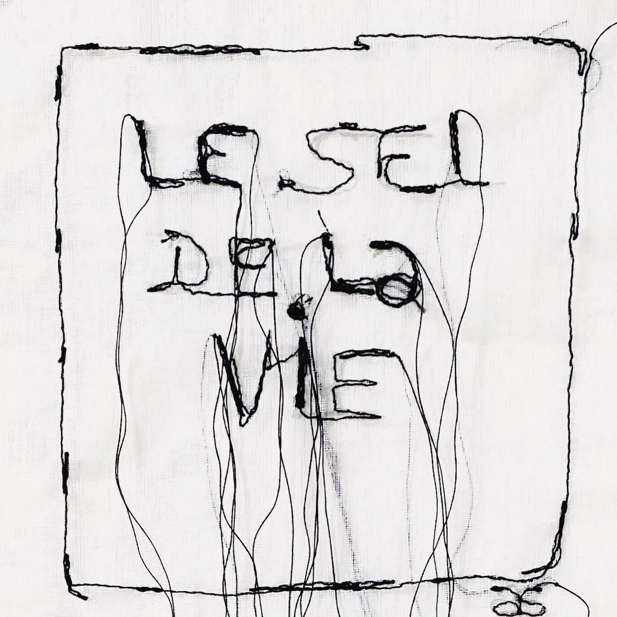 Invitation, goutte de conscience, mémo à accrocher ou encadrer, broderie à bras libre noire (au choix rouge, vert, or) sur organdi blanc, 15×15 cm.