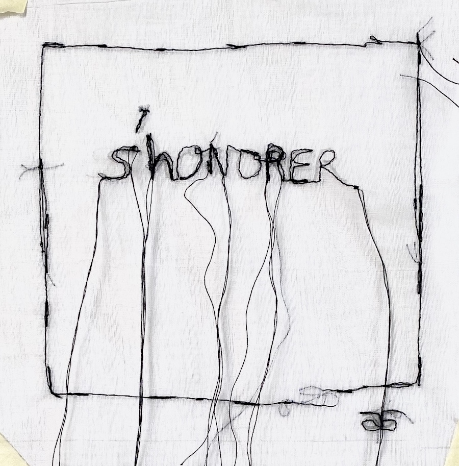 Invitation, goutte de conscience, mémo à accrocher ou encadrer, broderie à bras libre noire (au choix rouge, vert, or) sur organdi blanc, 15×15 cm.