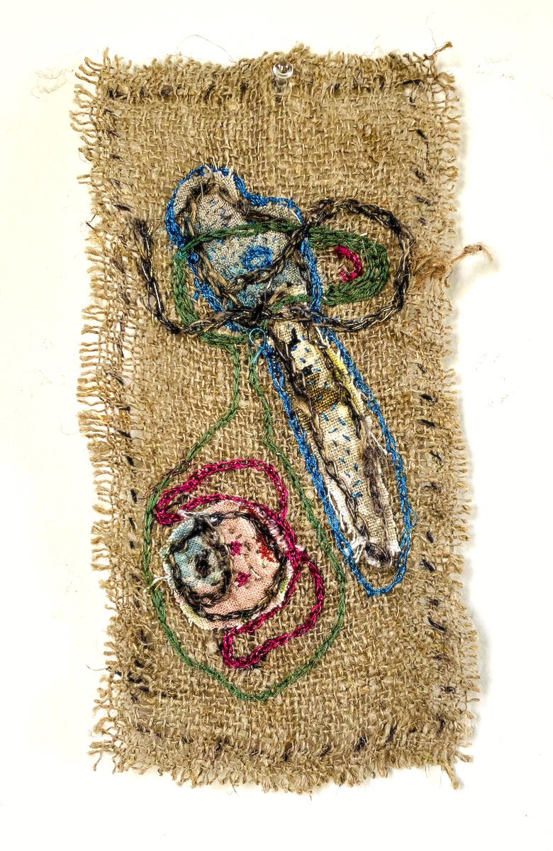 Tenture, broderie main, jute, 44×65 cm