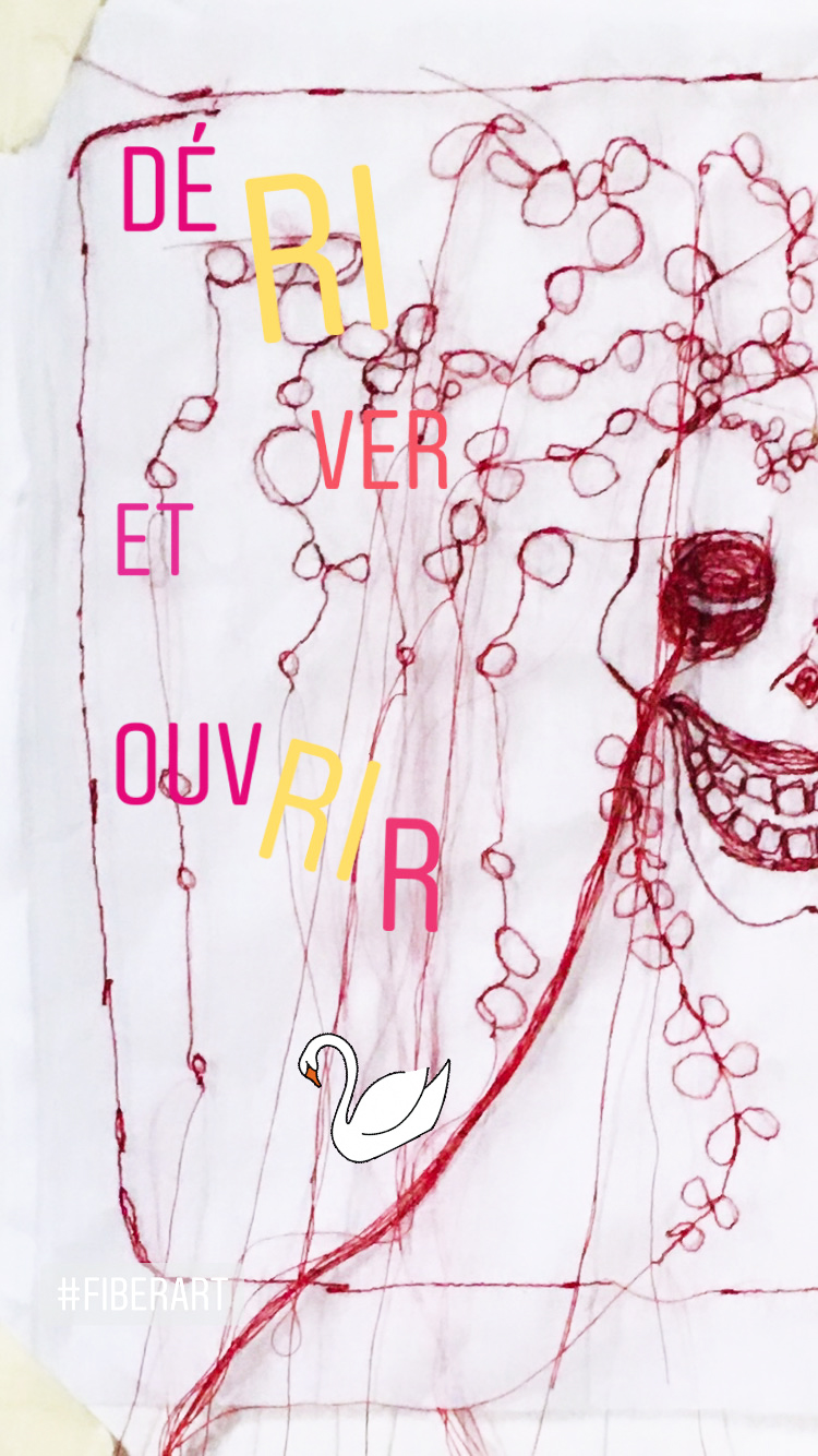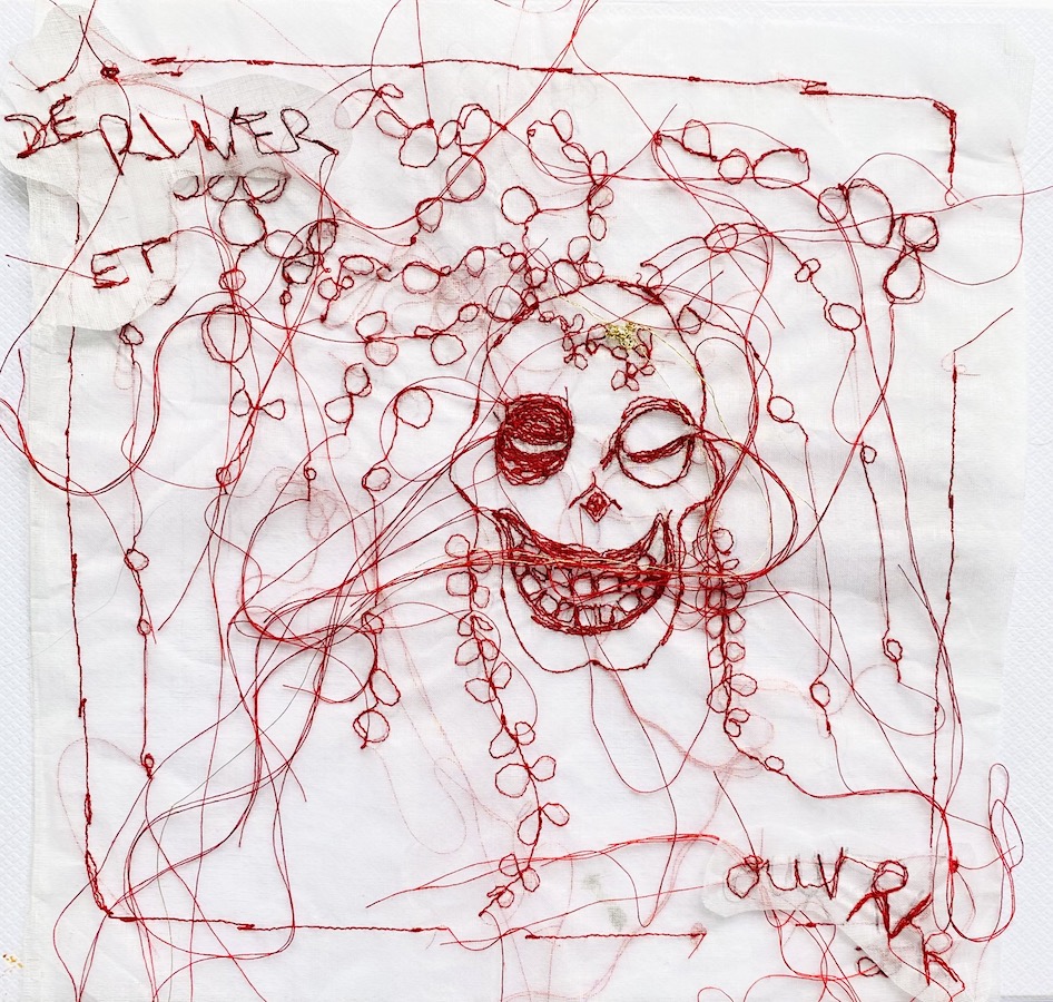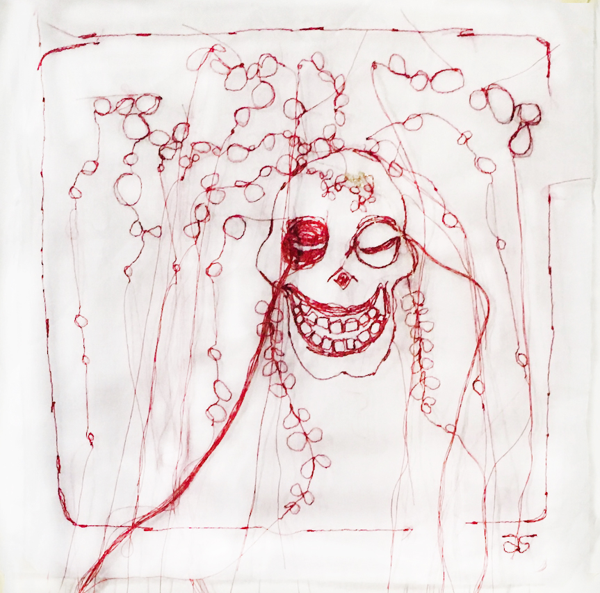 C’est avec l’aide d ‘une machine à coudre classique que j’ai brodé ce portrait sans peau. Et je l’utilise sans pied de biche qui guide et maintient en place le tissu. En effet lorsque je procède ainsi cela me permets de naviguer avec le tissu autour de l’aiguille librement sans entrave. Et je peux réaliser ainsi la broderie irrégulière et parfois maladroite que je recherche..C’est pourquoi les points brodés sont plus ou moins appuyés. Et les pensées qui se libèrent le font en affichant un grand sourire et un clin d’oeil. Ce portrait sans peau, la vanité joyeuse art textile « L’affranchie » », est brodé de fil rouge et, comme toute la série ‘même pas peur » sur un léger et évanescent organdi blanc. Il affiche ainsi une subtile transparence. C’est une des raisons pour lesquelles, je le préfère encadrer dans un entre deux verres, ou sur un fond blanc.