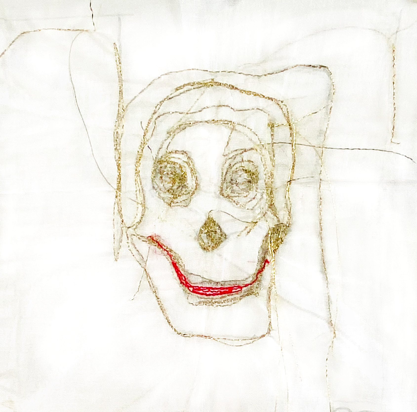 Vanité n°1, entité joyeuse, broderie à bras libre sur gaze de lin, 14×14 cm, 120 €