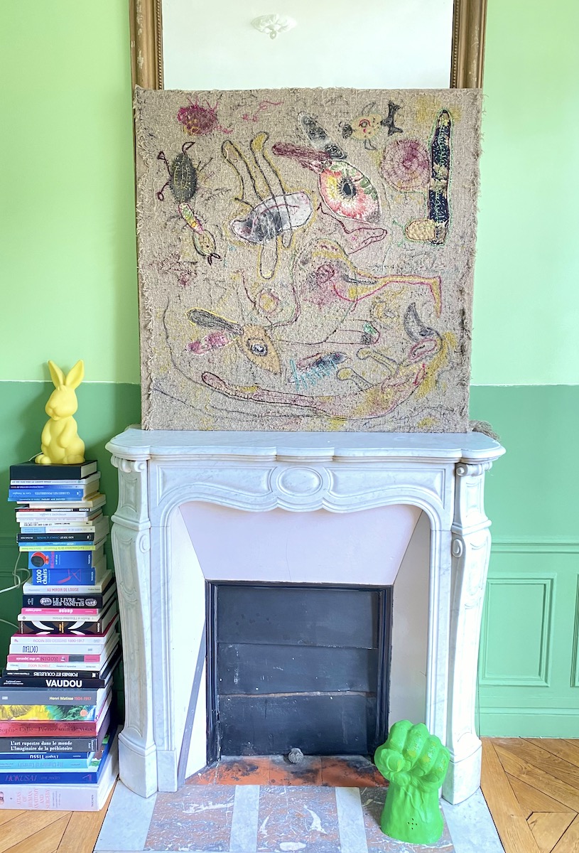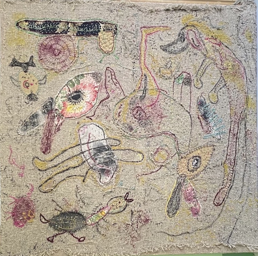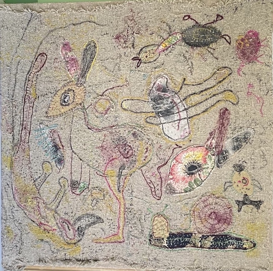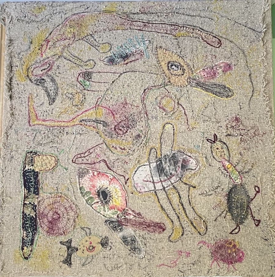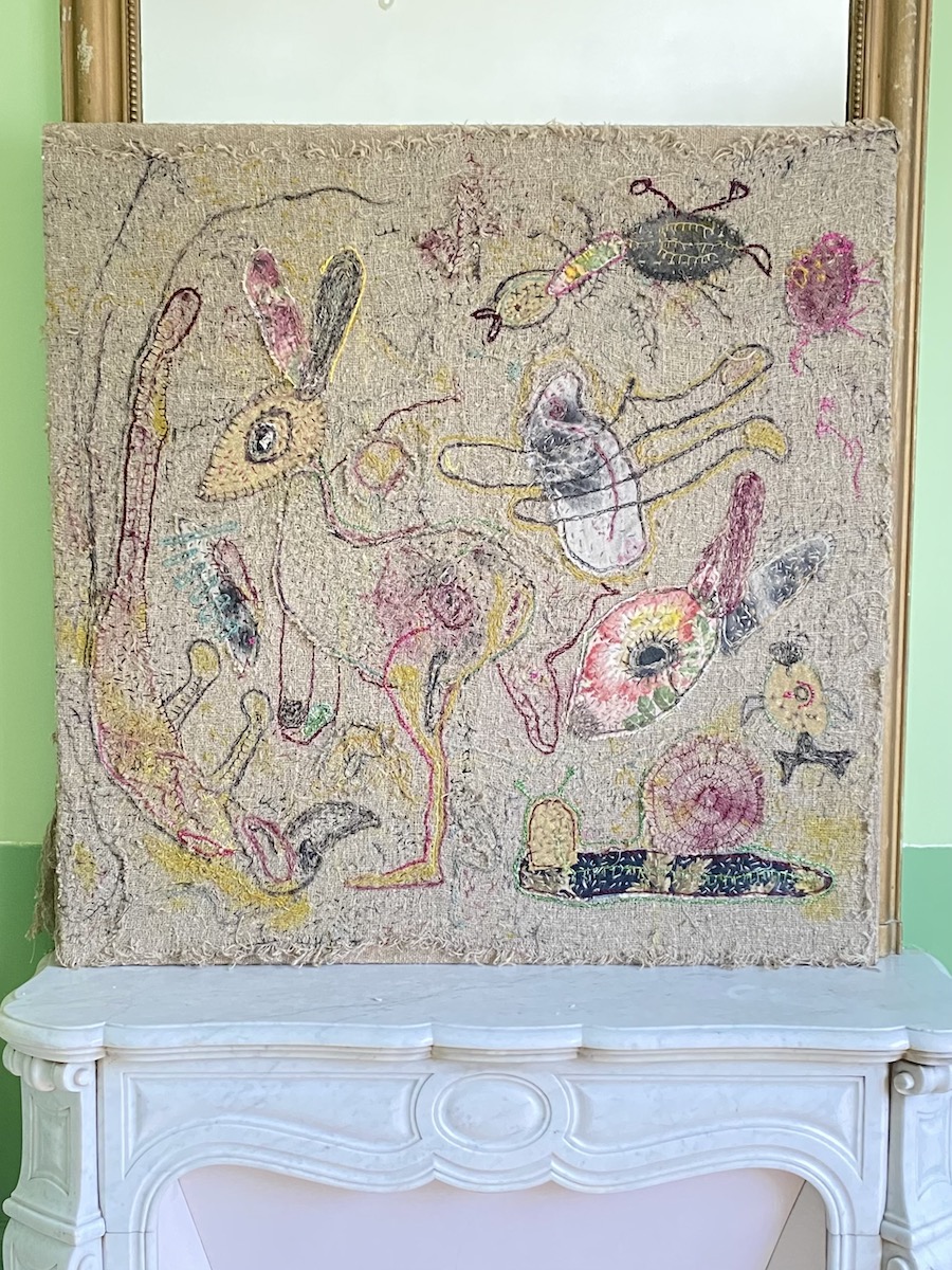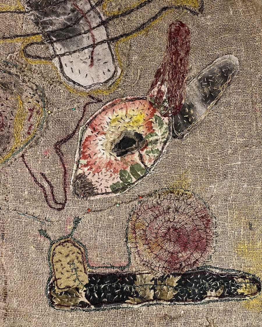 J’utilise plusieurs procédé et je procède en couches. D’abord, j’ai appliqué les tissus découpés, jute et chute de tissus d’éditeurs sur une grande toile de jute. Je fais appel à plusieurs techniques et points de broderies. La technique japonaise de rapiéçage » sashiko », pour les applications sur le fond, à laquelle j’ajoute des points de chainette et d’échelles. Je maintiens ainsi les tissus ensembles. Puis, les éléments de broderies, le choix des fils, l’ajout de formes s’opère intuitivement, et quelques esprits de la nature s’invite sur la toile. Le choix des broderie guide la main.