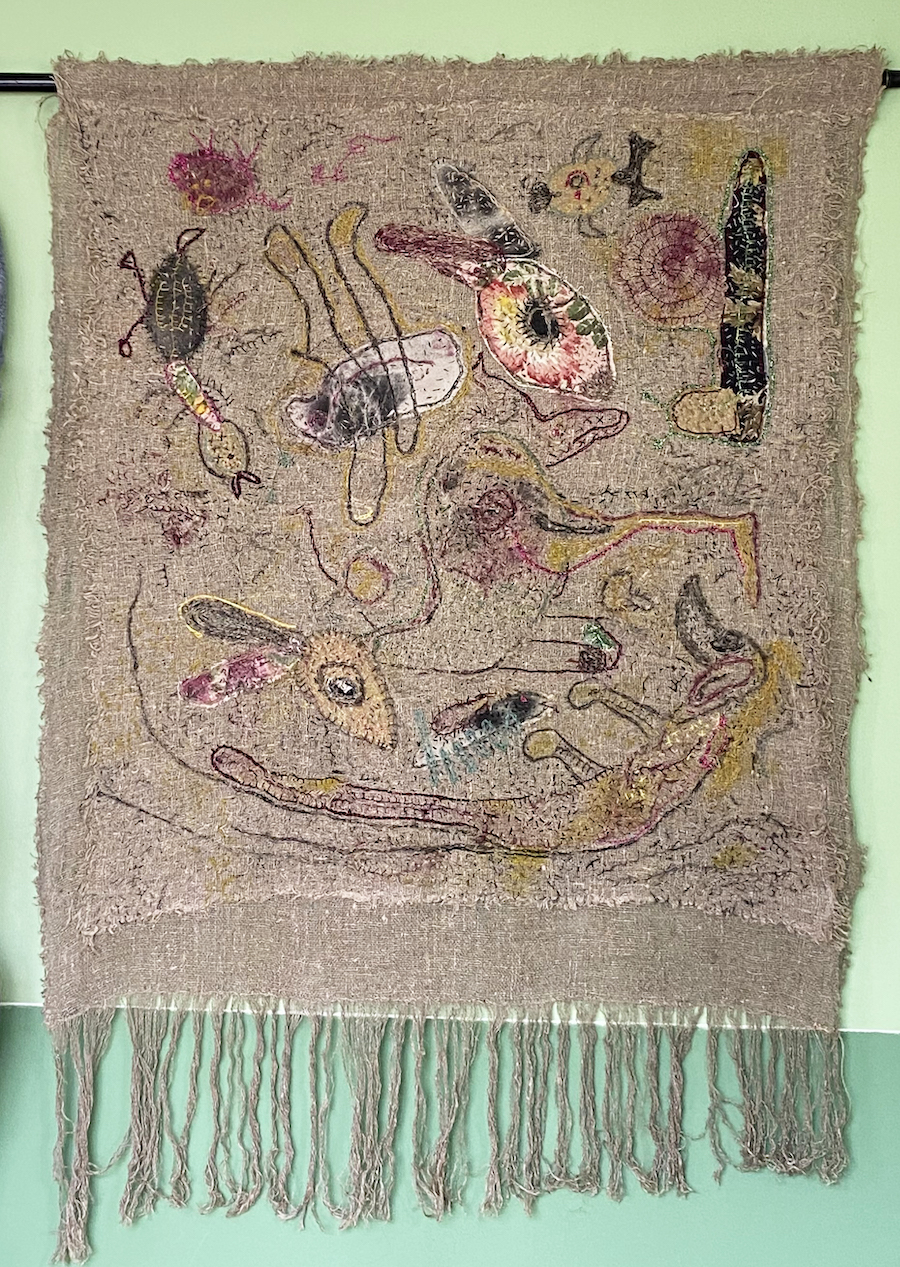 « La larme de la colombe », tenture brodée, imaginée pour l’exposition « Je rêve d’un monde en paix » à la galerie L’oeil bleu, 40×80 cm. avril 2022