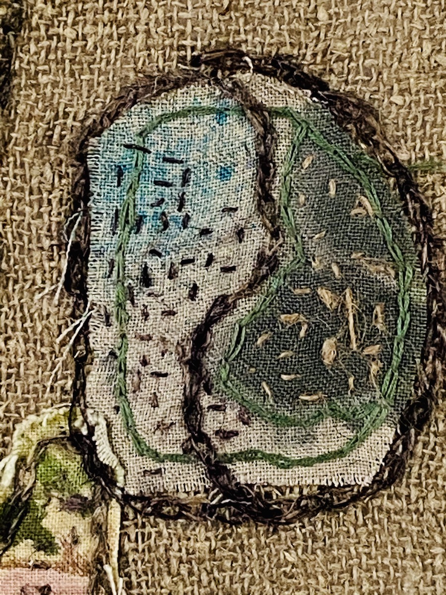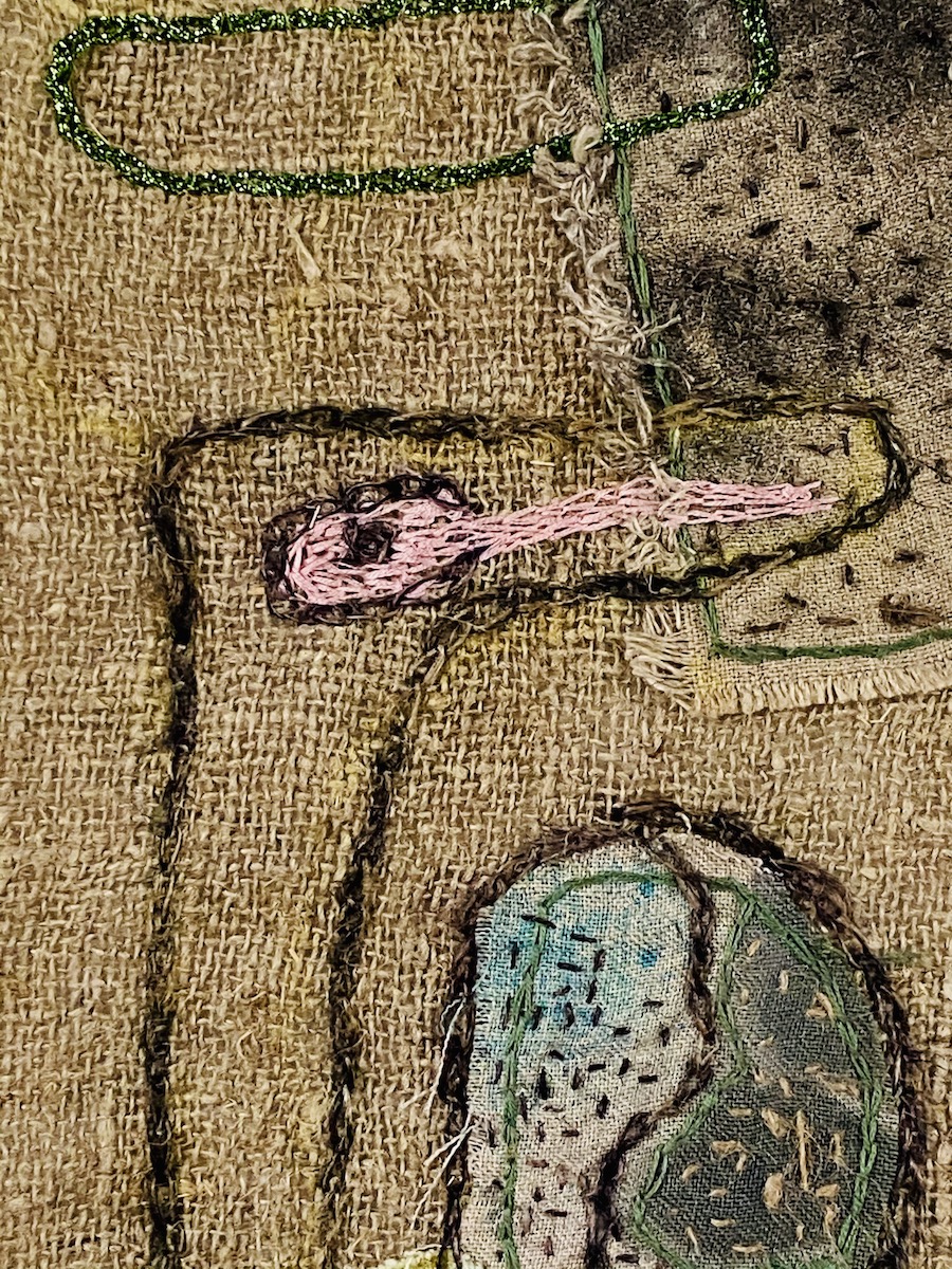 art textile illustrant les miracles de l’impermanence, broderies à la main toile de jute et autres tissus recyclés. variation n°8, 36×53 cm, 160 €