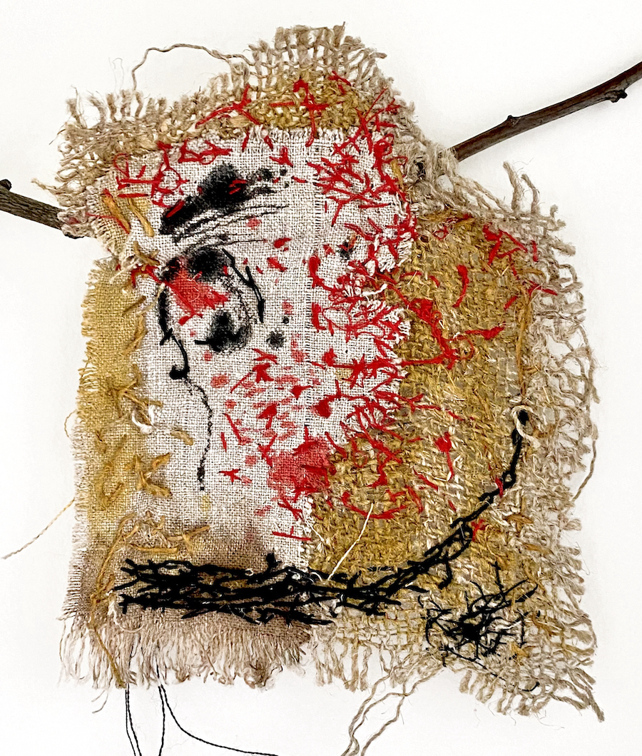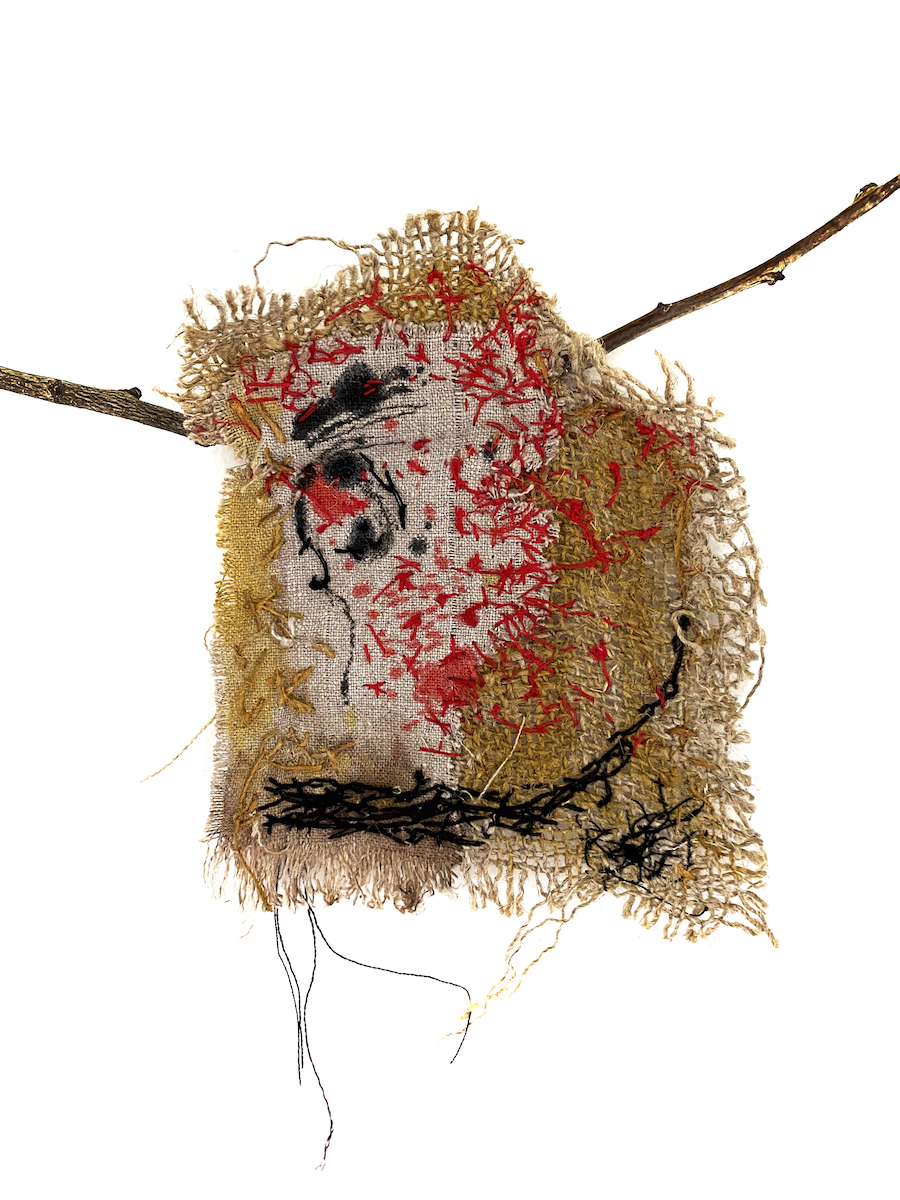 Cet ornement art brut, a donc sa source dans le fragment émotif. Et l’encre de chine est mon offrande au vieux lin usé. J’ai dégoté une petite pièce de toile de jute délaissée dans un tiroir dévoué à cet effet . Et sans doute d‘autres l’auraient jetée tellement elle était parfaitement imparfaite. Je l’ai utilisé telle quelle, c’est à dire à la découpe irrégulière comme déchirée. D’ailleurs, je n’ai pas cherché à re couper net aucune de ces chutes. Au contraire, je trouve leurs formes gracieuses et touchantes. Et du lin et de la jute, l’un supportera l’autre. J’ai brodé uniquement avec des fils à repriser rouges et noirs. Sans chercher à utiliser un point particulier, la main et l’aiguille papillonnent à l’instinct sur les matières. Par ailleurs, Ornement brodé art brut, Fragment émotif peut être encadre ou bien enfiler sur une branche ramassée, un passant est prévu à cet effet.