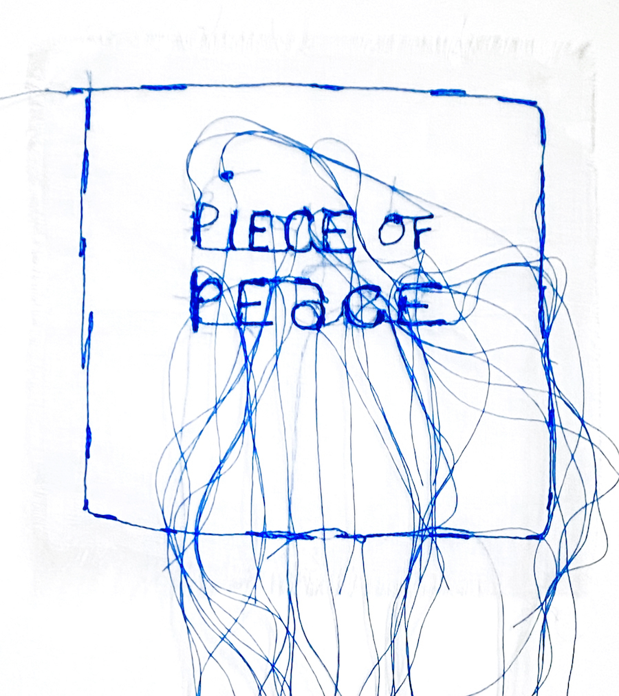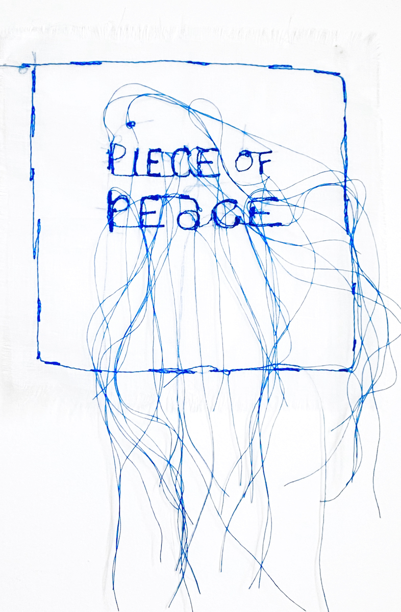 J’ai réalisé Piece of Peace broderie bleue comme les autres gouttes de conscience, à la machine à coudre classique. En revanche, je retire le pied de biche, et peux ainsi naviguer avec le tissu facilement autour de l’aiguille. Je brode au fil de coton sur un léger organdi blanc évanescent. Cette technique me permets de coudre la broderie irrégulière que je recherche et m’applique à produire. En effet, je peux ainsi obtenir différentes épaisseurs de fils. J’ajoute les fils suspendus de chaque lettre en dernier.