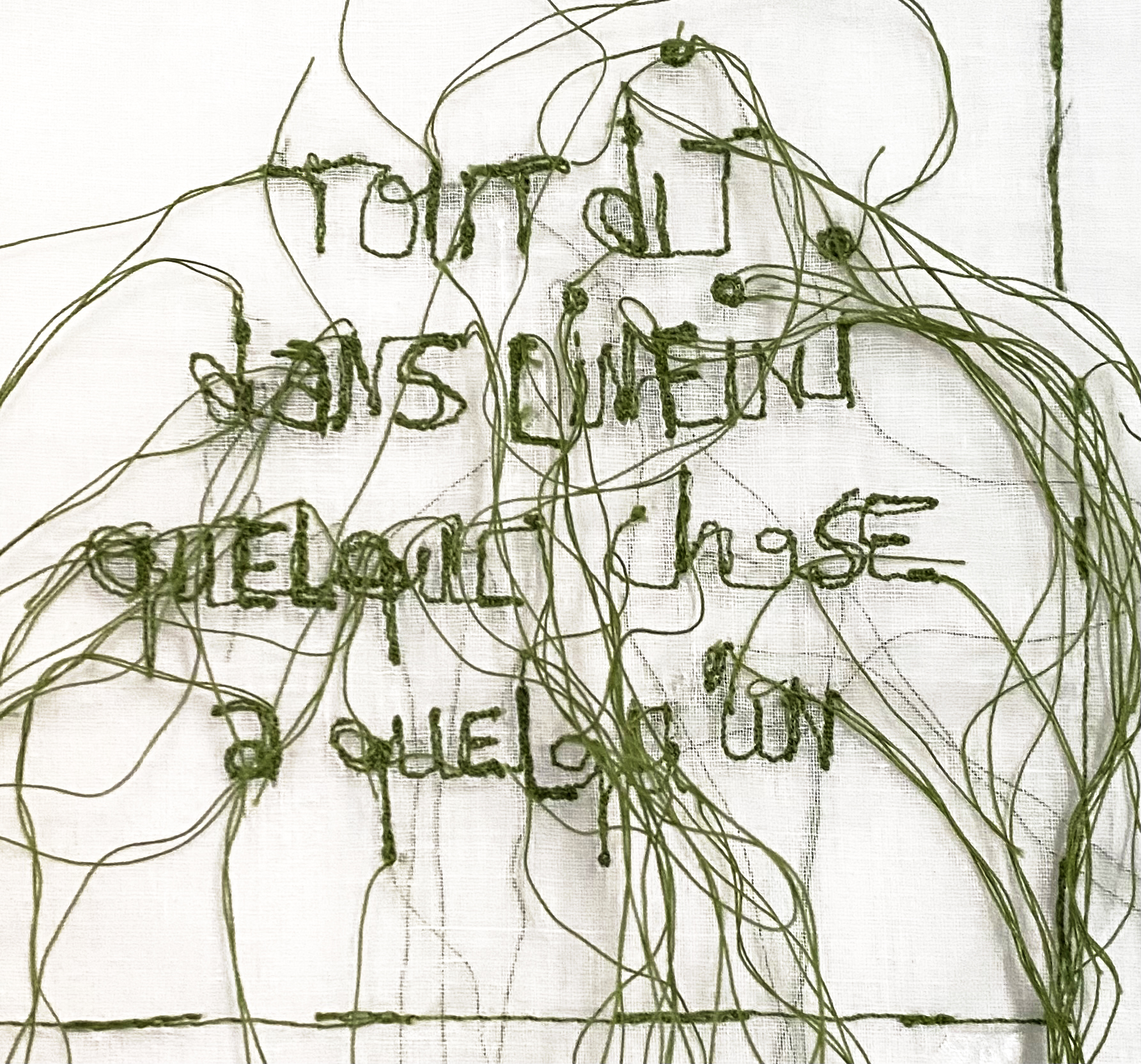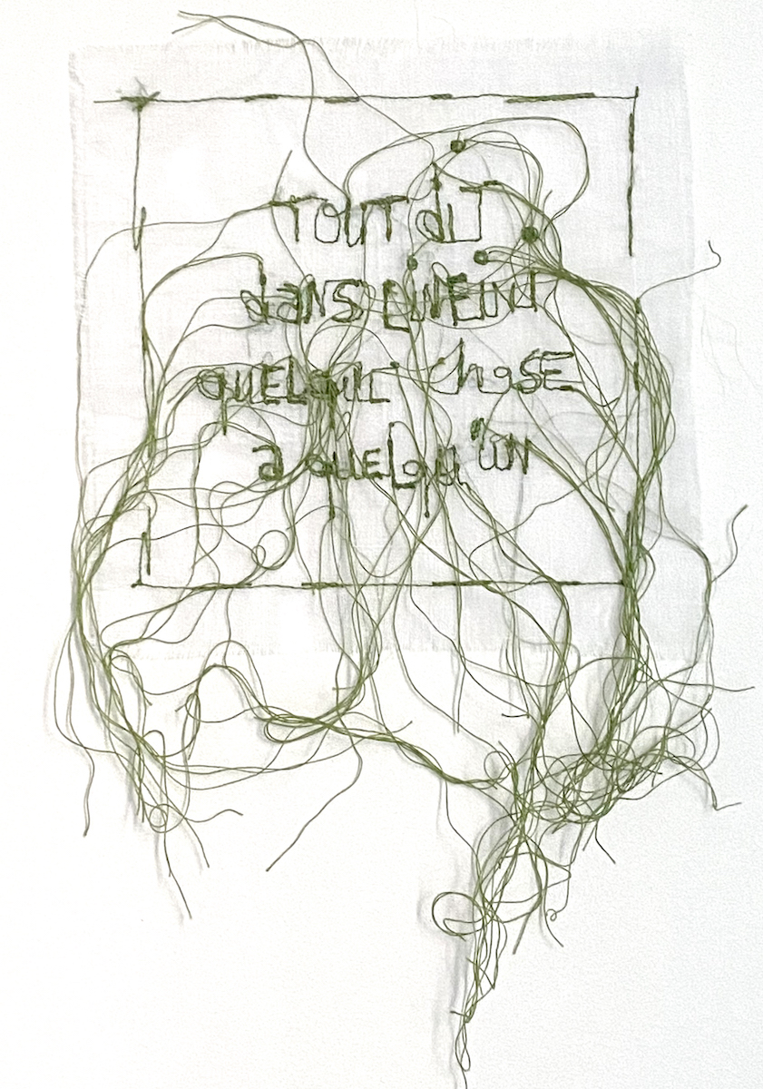 - Étiquettes: Broderie fil, infini, conscience, invitation, , fil vert, mémo, organdi blanc, Victor Hugo, poésie.