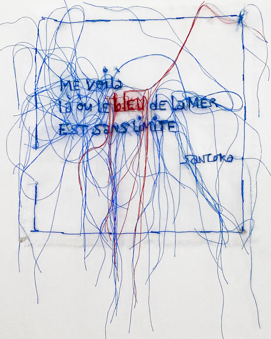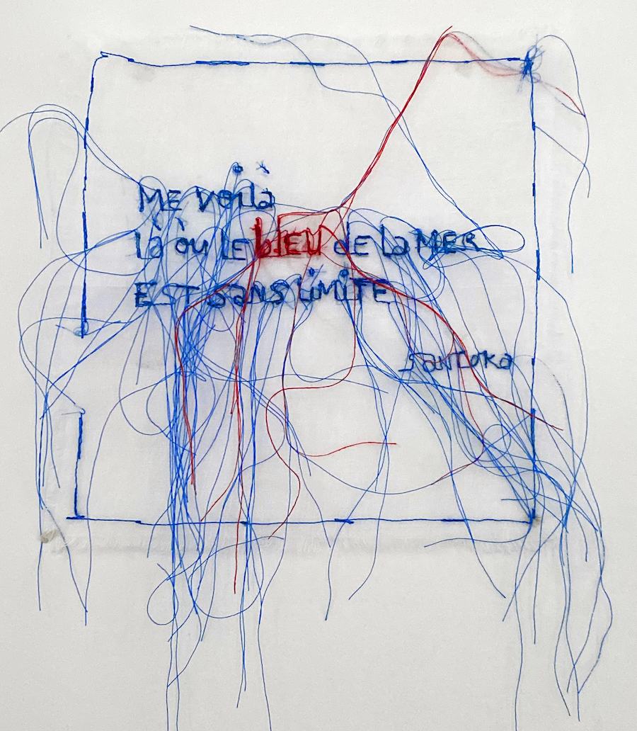 J’ai cousu Poésie et broderie Le bleu infini à la machine à coudre classique. En revanche je l’utilise sans pied de biche. Ainsi, je navigue avec le tissu autour de l’aiguille, d’une façon plus libre. A l’aide de fils de coton bleu et rouge, je brode les lettres, d’avant en arrière à ma guise. En effet ce procédé me permet de réaliser une couture irrégulière. Je recherche et m’applique en brodant à obtenir une broderie un peu maladroite. Dans un second temps, une fois le texte réalisé, je repasse pour ajouter les fils qui resteront en suspension, dépassant parfois du cadre. Cette Poésie et broderie Le bleu infini peut être encadrer entre deux -verres par exemple, pour garder la légèreté et la transparence de l’organdi.
