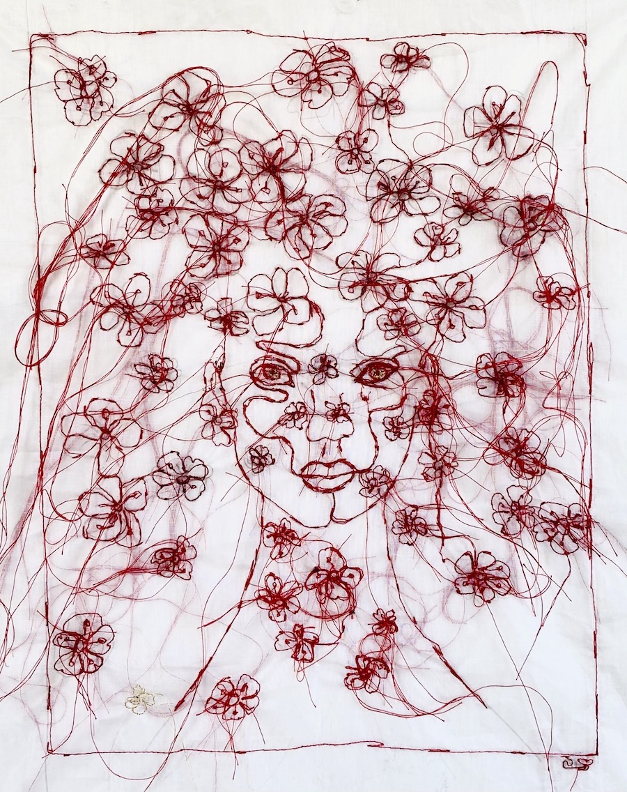Portrait avec peau, célébrant le printemps, piqure à bras libre sur organdi, 32×40 cm, 240 €