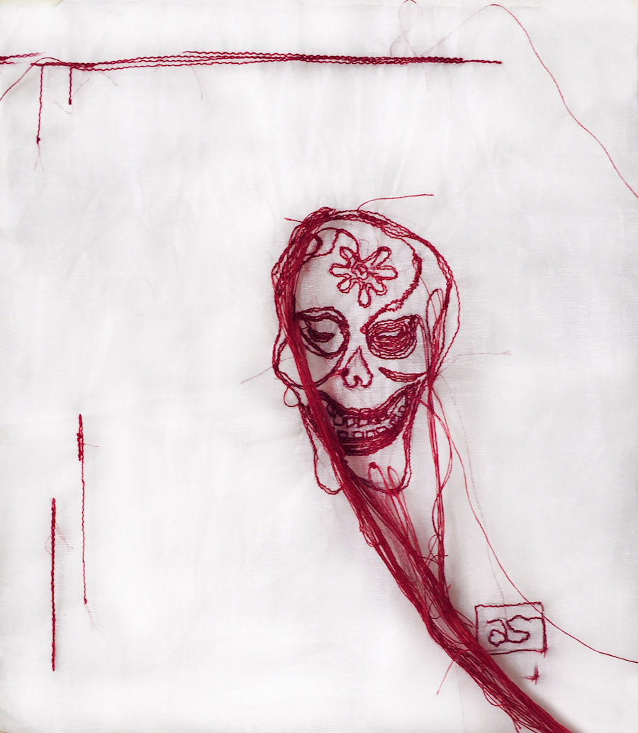 Portrait blanc sans peau, vanité illustrant la question de notre regard sur la vie, broderie à bras libre rouge sur organdi blanc, série « même pas peur », 19×21 cm.