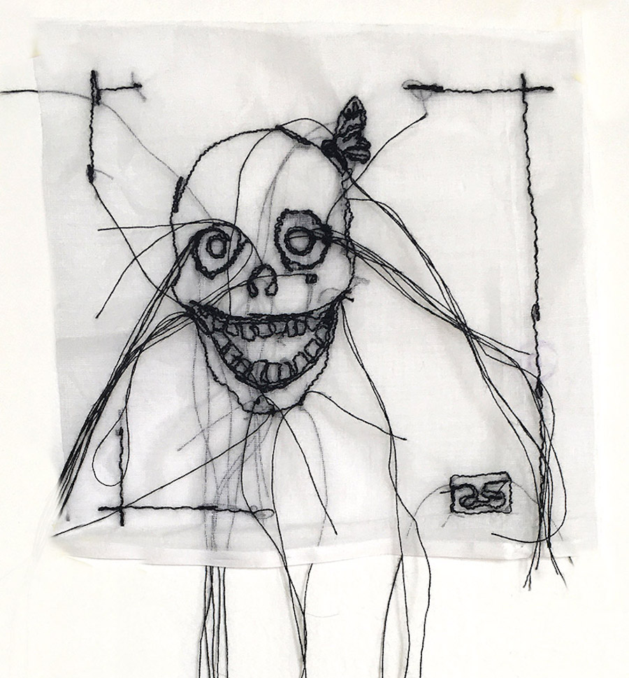 Portrait sans peau, vanité illustrant notre regard sur la vie, broderie noire à bras libre sur organdi blanc, série « même pas peur », 16×16 cm.